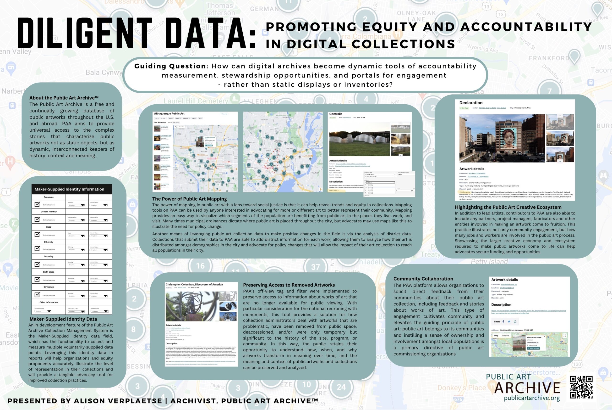 Earlier this month, the Public Art Archive’s (PAA) Alison Verplaetse presented at the Midwest Archives Conference in Chicago, IL. Her presentation, Diligent Data: Promoting Equity & Accountability in Digital Collections, showcases how PAA can be used as a digital site of equity and transparency, as well as a discursive space to dig deeper into the critical analysis of and response to works of art over time. Utilizing digital archives in this way can offer ample opportunities to demonstrate and record how public art shapes and is in dialogue with its community while its meaning and impact changes over time.