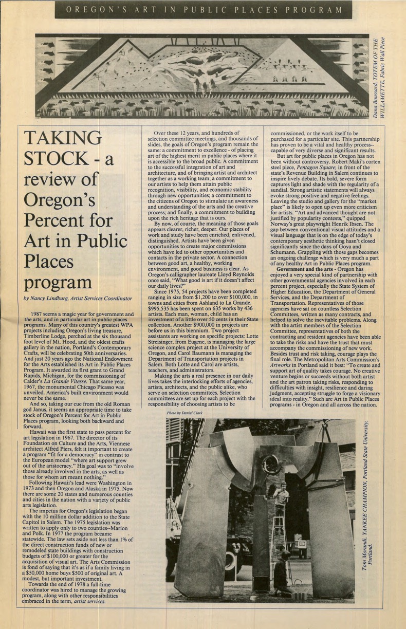 1987, Oregon Art in Public Places newsletter, Page 1, a year in review featuring Tom Morandi’s work Yankee Champion