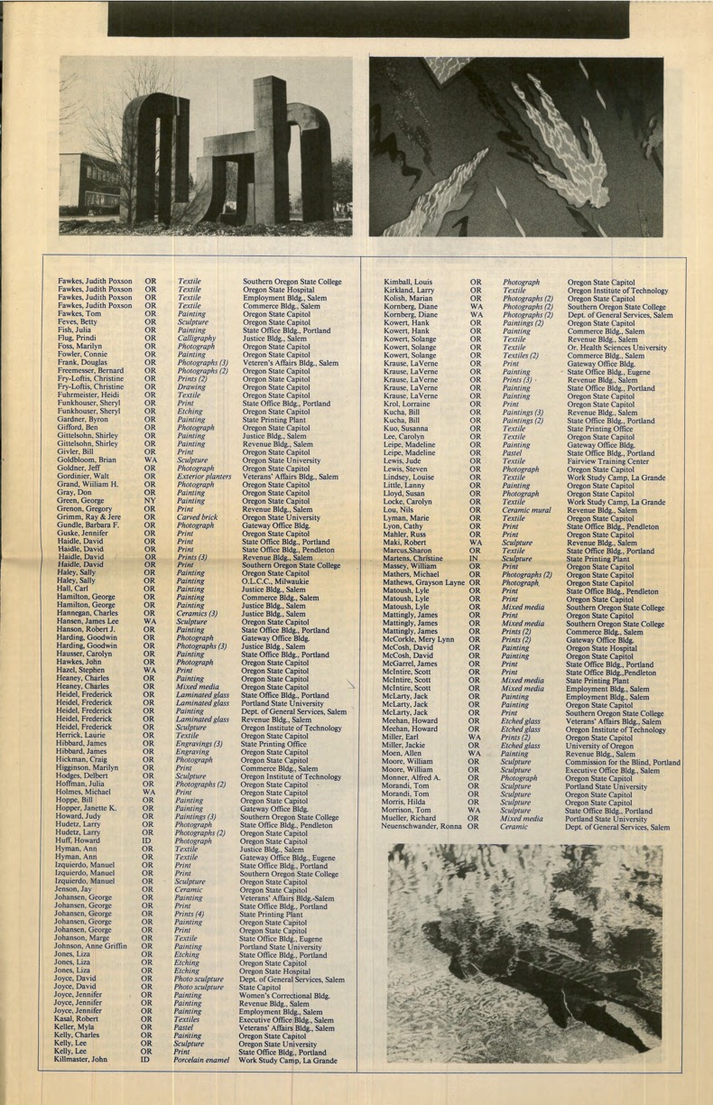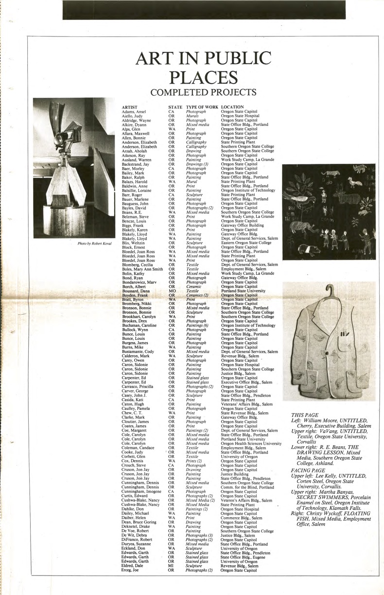 1987, Oregon Art in Public Places newsletter, Page 2, List of Art in Public Places Completed Projects for the year. Featured images include work by William Moore, Va Vang, and R.E. Beans