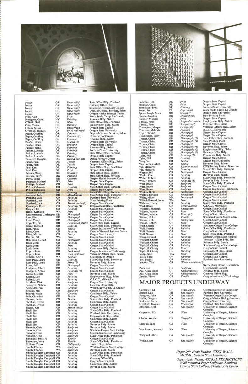 1987, Oregon Art in Public Places newsletter, Page 4, List of Art in Public Places Completed Projects for the year continued, as well as Major Projects Underway. Featured images include work by Henk Pander and Nexus