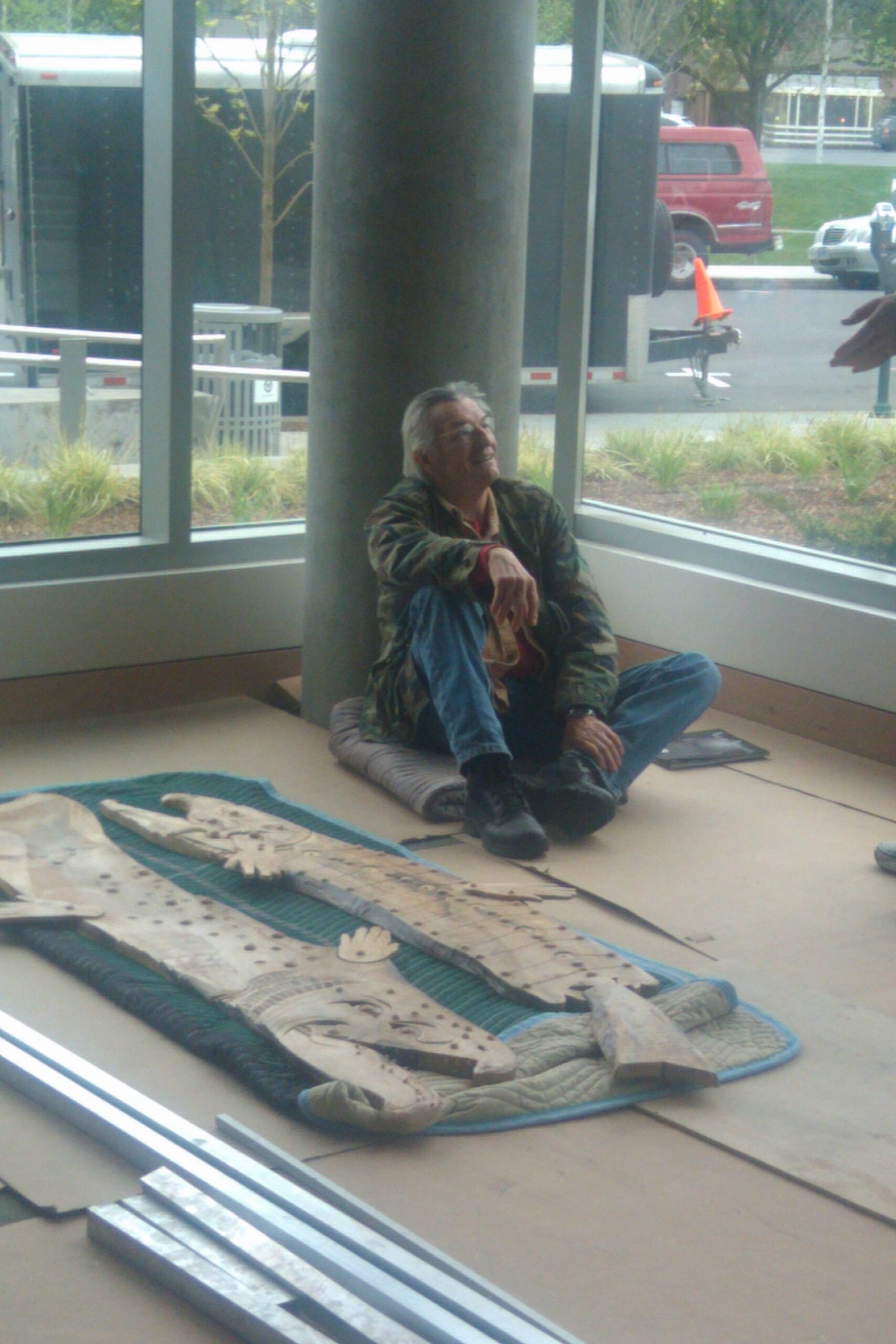 2011, Rick Bartow rests with his wood carvings Facing The Future Eyes Wide Open for the University of Oregon Ford Alumni Center
