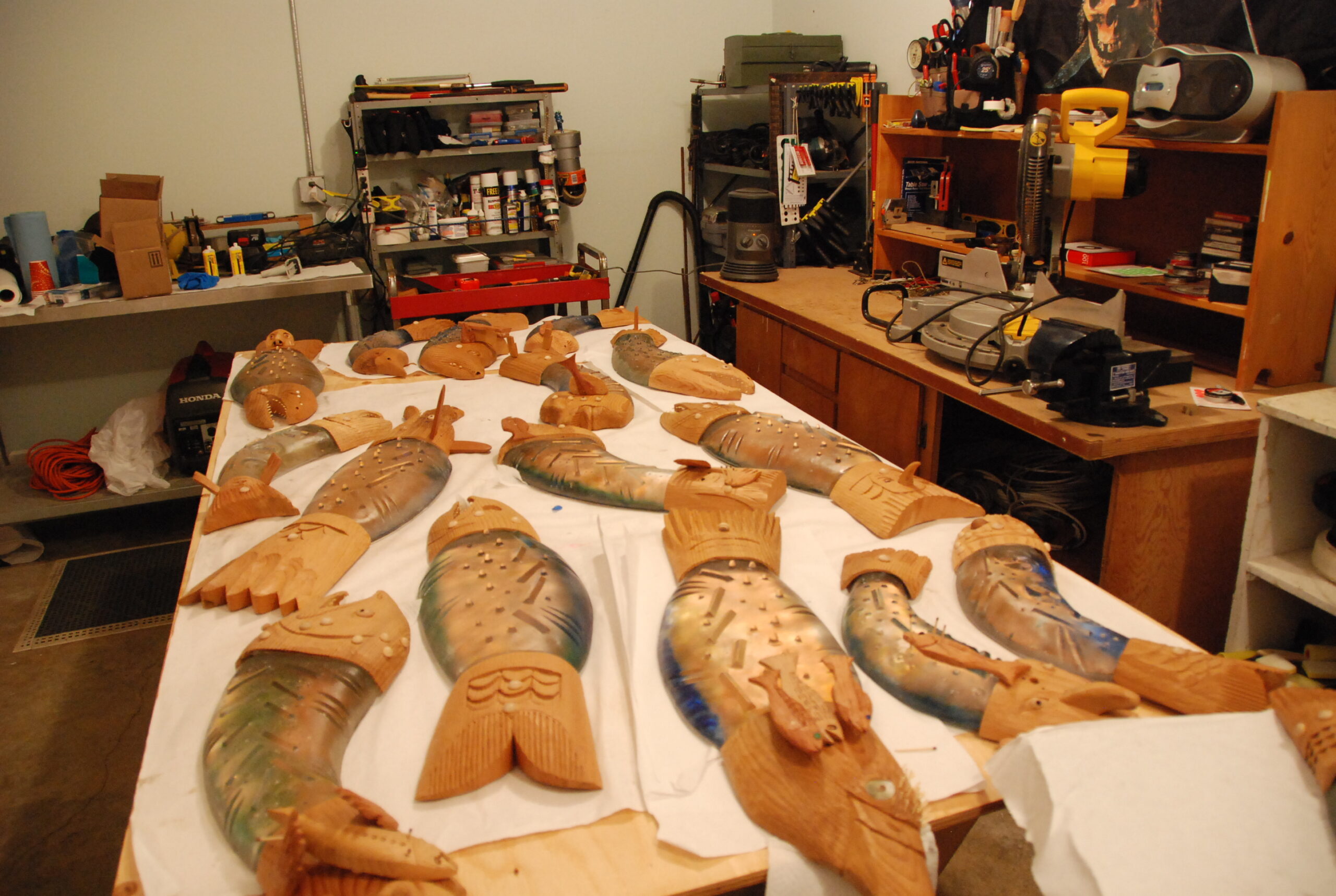 2013, Fish being fabricated by Rick Bartow and Nancy Blair for their work Heartbeat of the River at Western Oregon University Health & Wellness Center