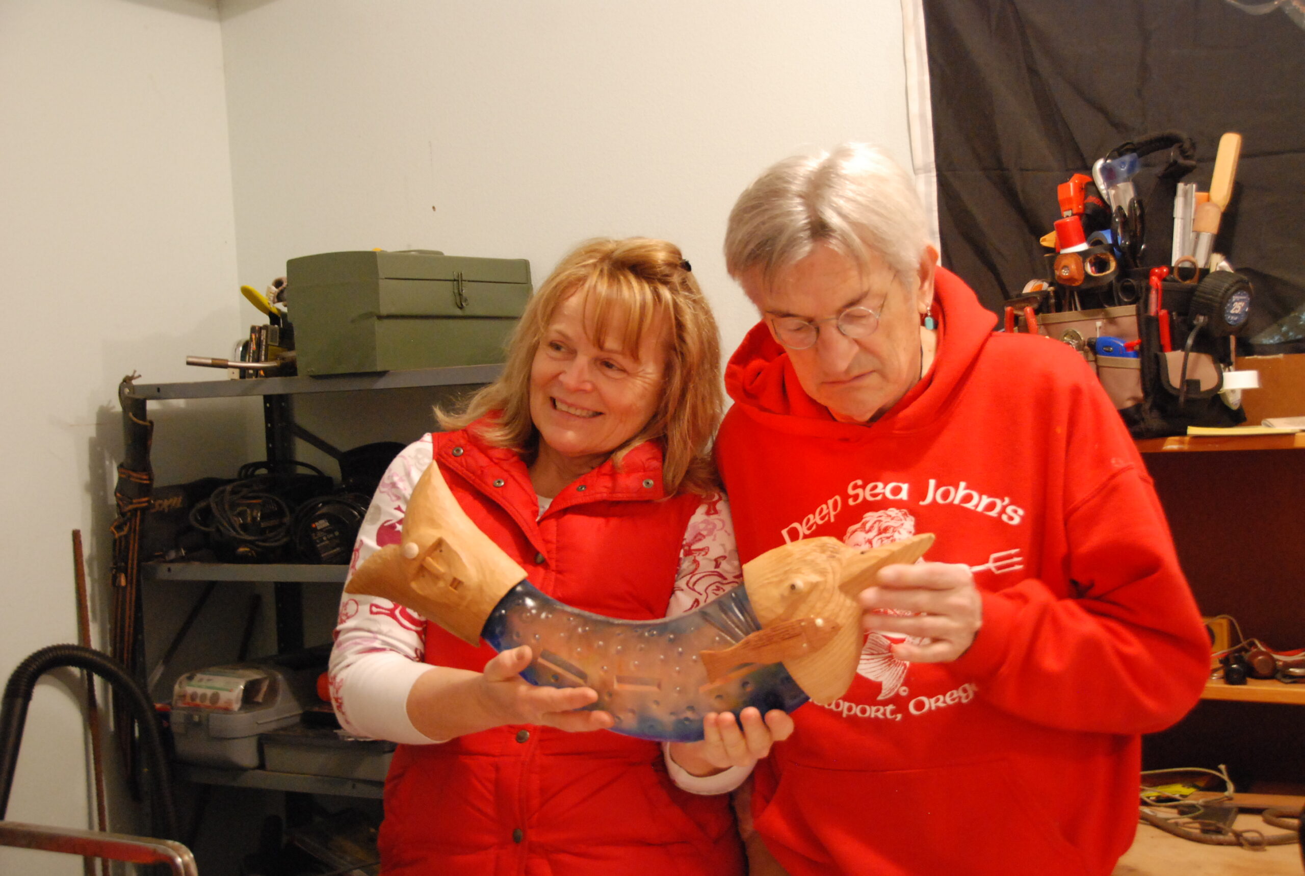 2013, Rick Bartow and Nancy Blair holding a fish for their work Heartbeat of the River at Western Oregon University Health & Wellness Center