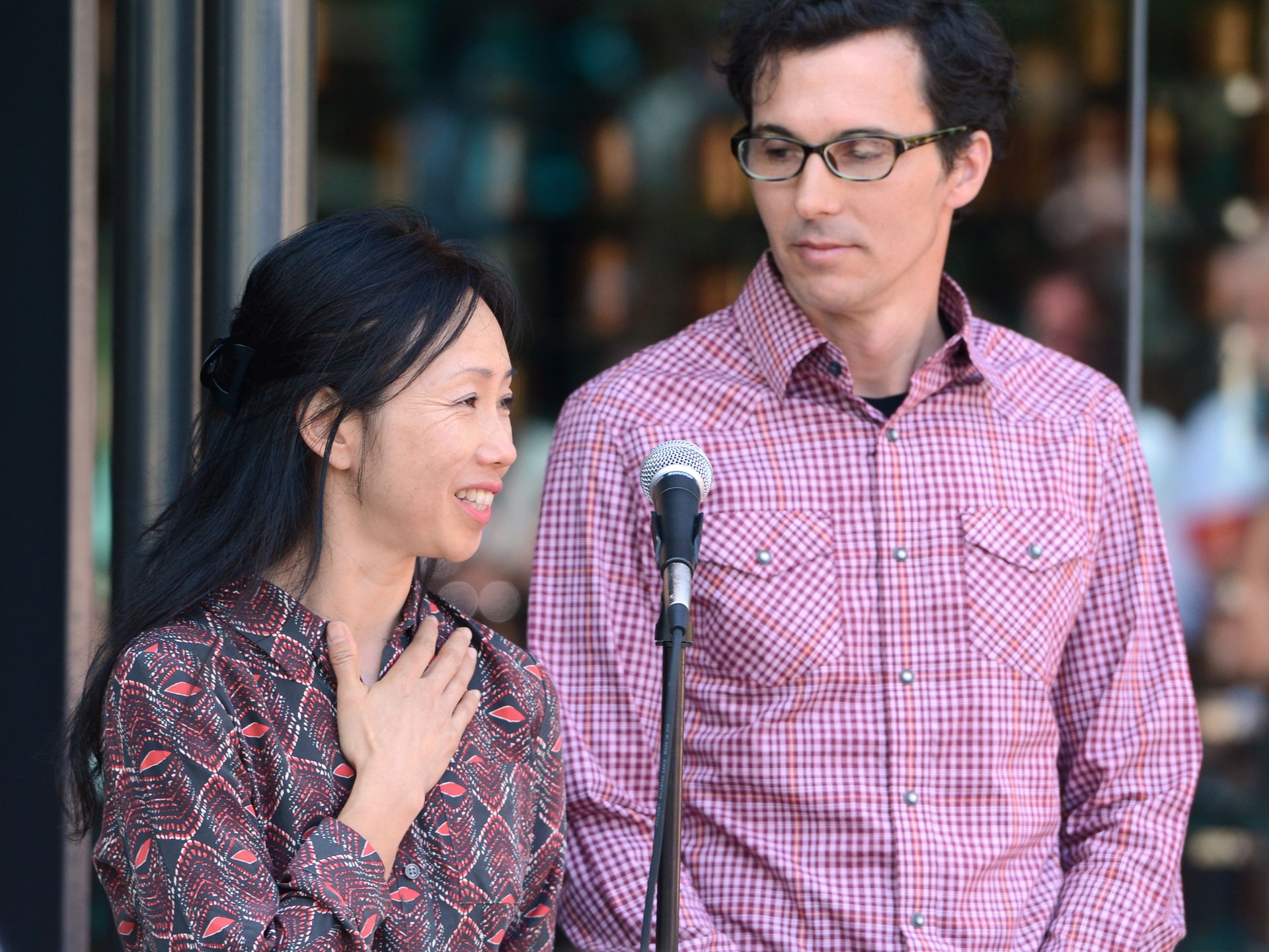 2014, Annie Han and Daniel Mihalyo collectively known as Lead Pencil Studio giving a speech at the opening of their project OSH Patient Memorial at the Oregon State Hospital, Salem