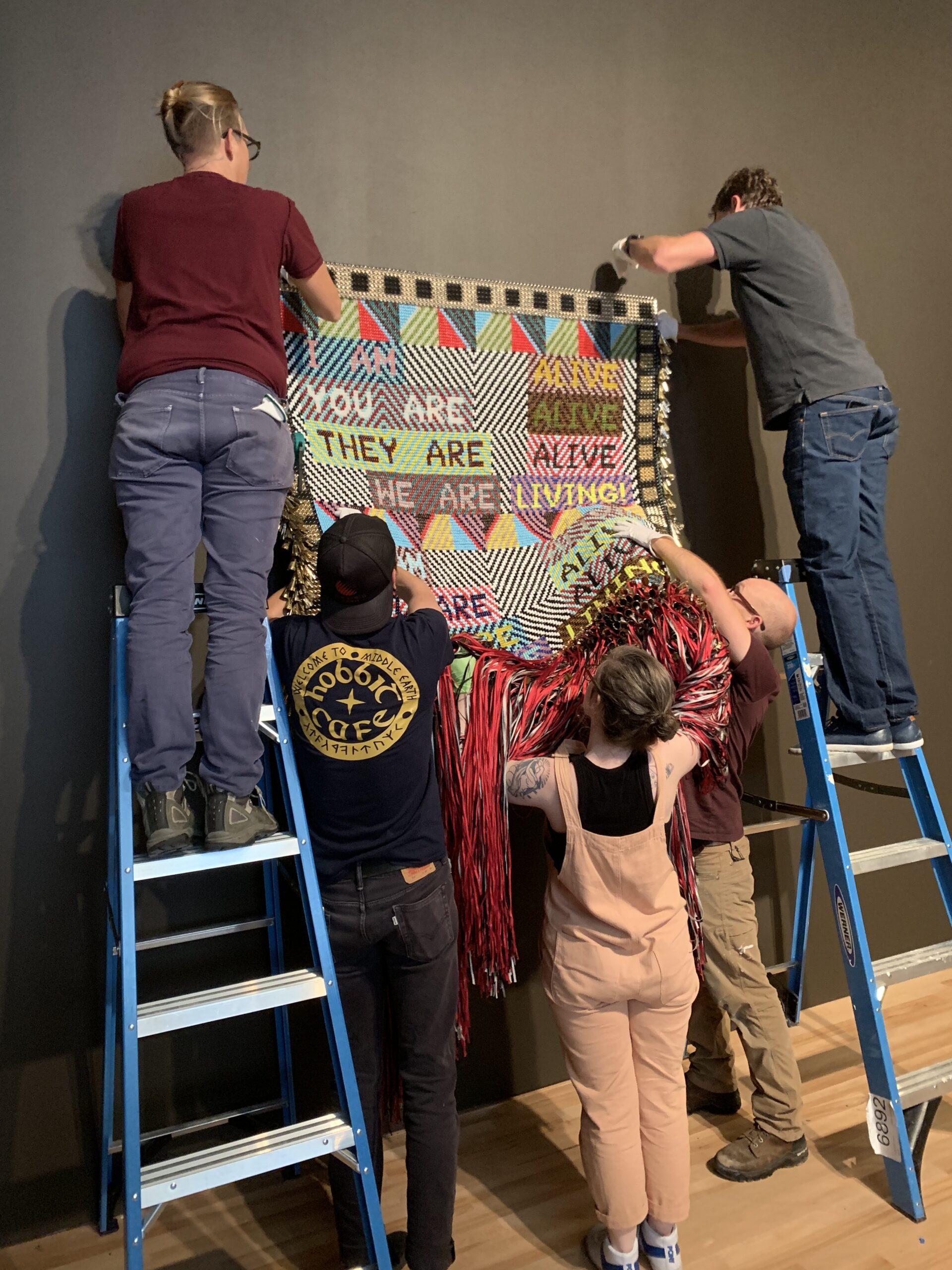 2016, Installation team hanging Jeffery Gibson’s work ALIVE! at Portland State University Vanport Building Return to timeline home