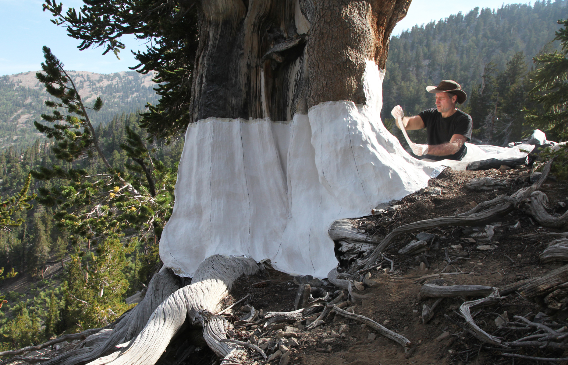 2017, John Grade seen making a cast of a living bristlecone pine in the forest for his work Treeline at Portland State University Karl Miller Center