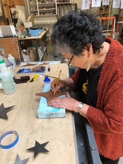 2018, Lillian Pitt shown working on the fabrication of Spirit Guardians in collaboration with Juno Lachman and John Fritz for Oregon Military Department Ft Dalles Readiness Center