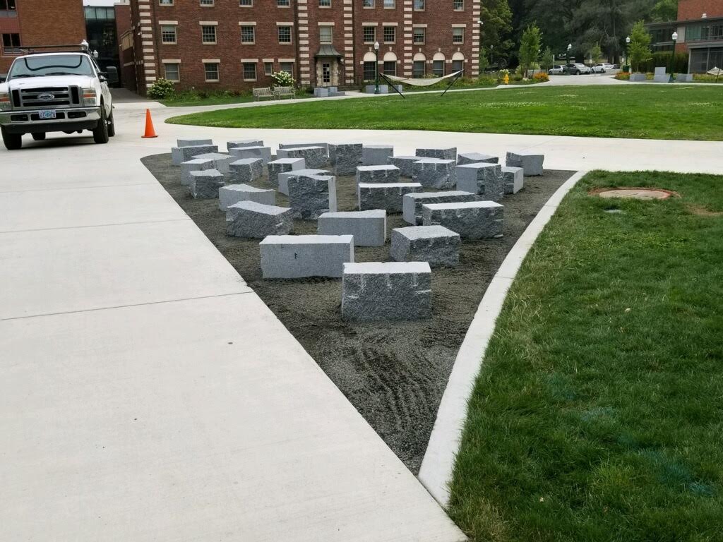 2018, Stone blocks placed and pinned for Adam Kuby’s work Aggregations at University of Oregon Erb Memorial Union (EMU)