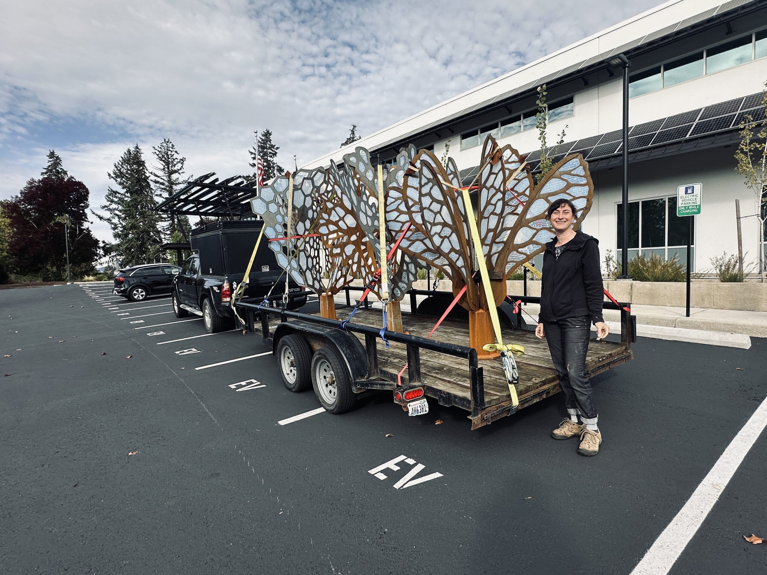 2024, Crystal Schenk stands with artwork Ballads of Small Worlds created in collaboration with Shelby Davis on installation day at North Valley Complex, Wilsonville