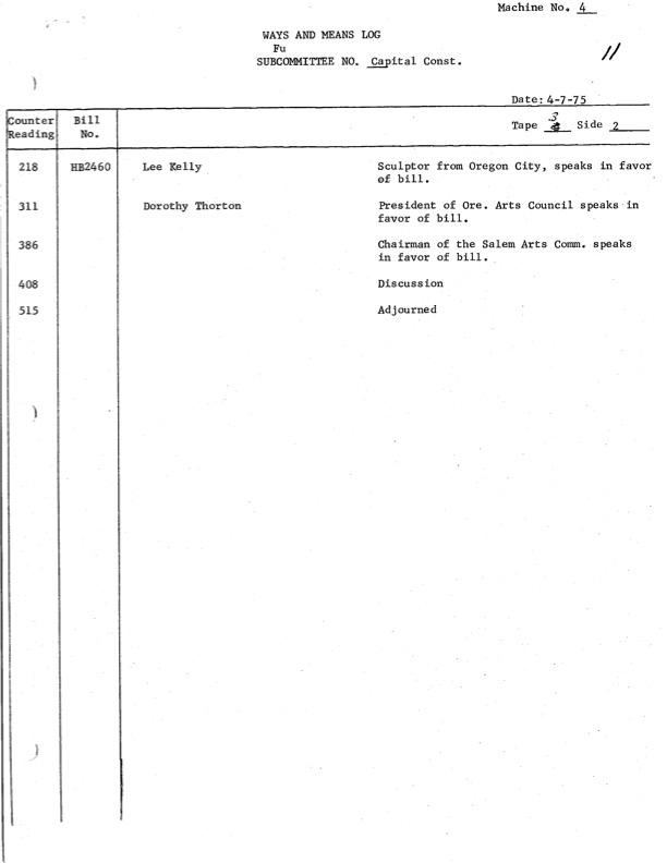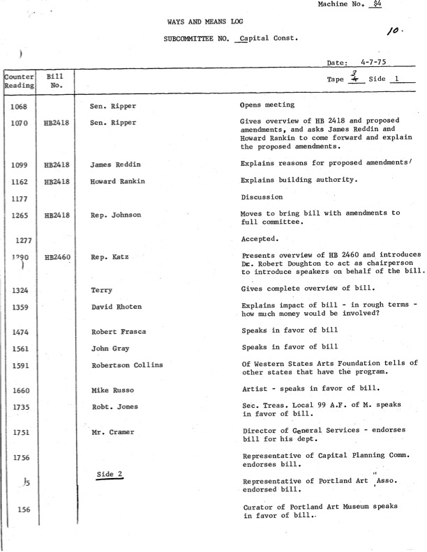 April 7th 1975, Ways and Means Bill Log, includes notes from witnesses