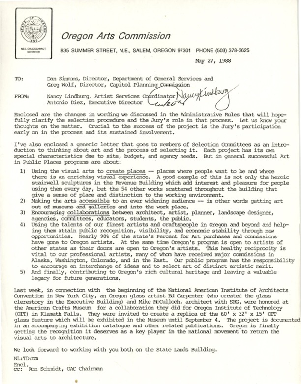 May 27th, 1988, Letter to the Department of General Services and Capitol Planning Commission explaining changes to administrative rules and keys points for a successful project