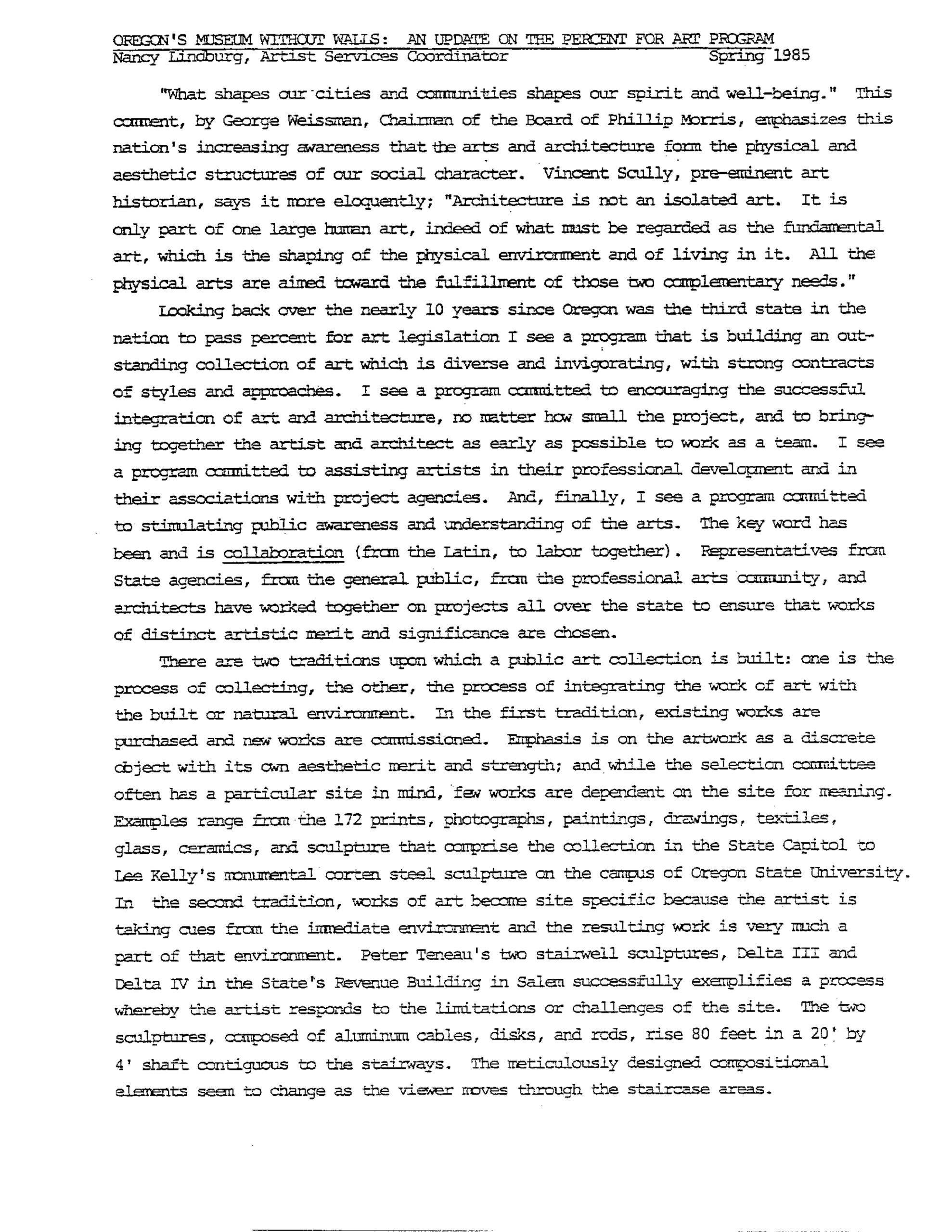 Spring 1985, Page 1-2, Essay by Nancy Lindberg “Oregon’s Museum Without Walls”