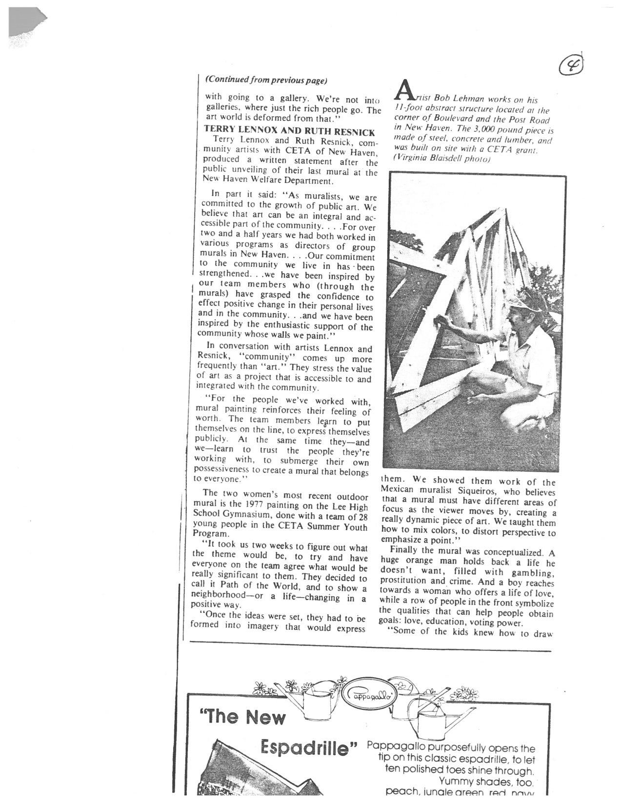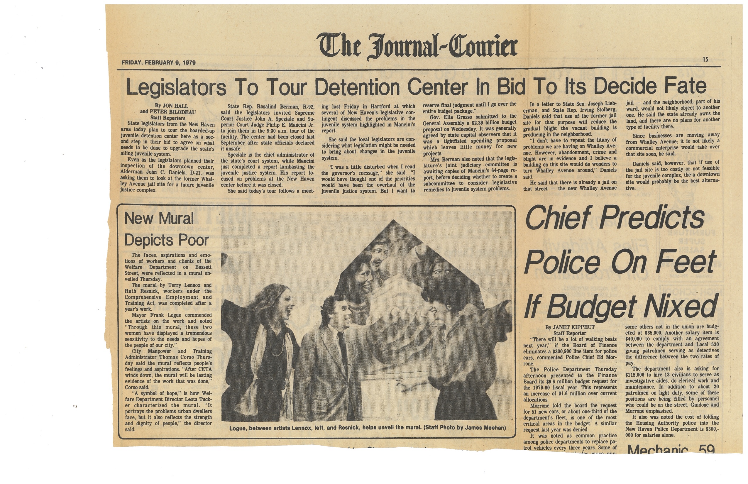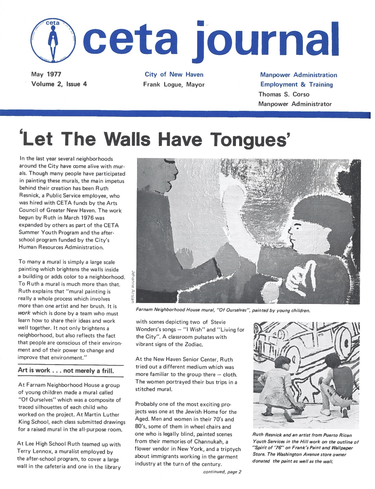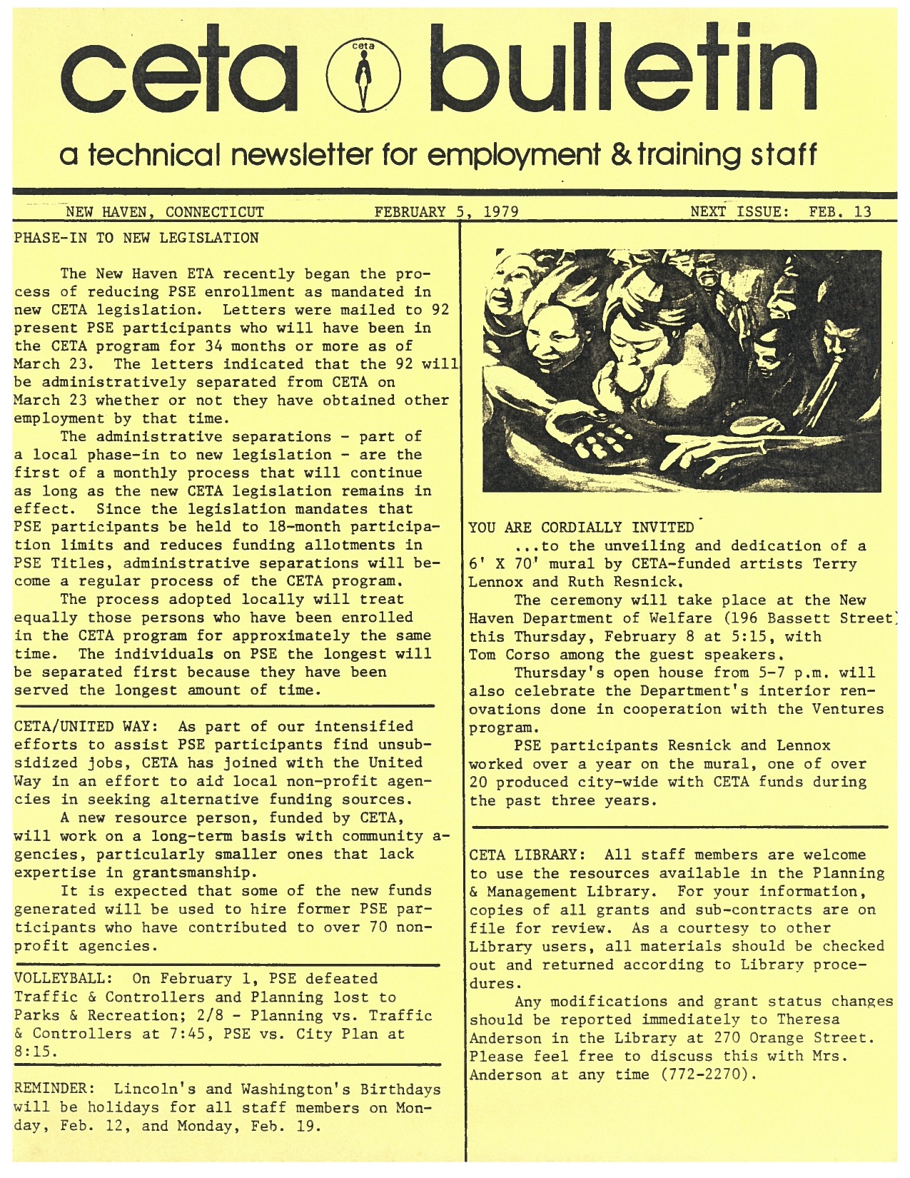 New Haven has a long tradition of arts coverage in city newspapers. The CETA program coincided with a blossoming of local arts coverage in dailies and weeklies such as the New Haven Register and the New Haven Advocate. Before the era of websites, social media, and podcasts, print media was the primary way through which New Haveners learned of the artistic activities of the Elm City. Further, it was also the way New Haven connected with the mural movement across the country and beyond, as seen in the newsletters of the National Murals Network.