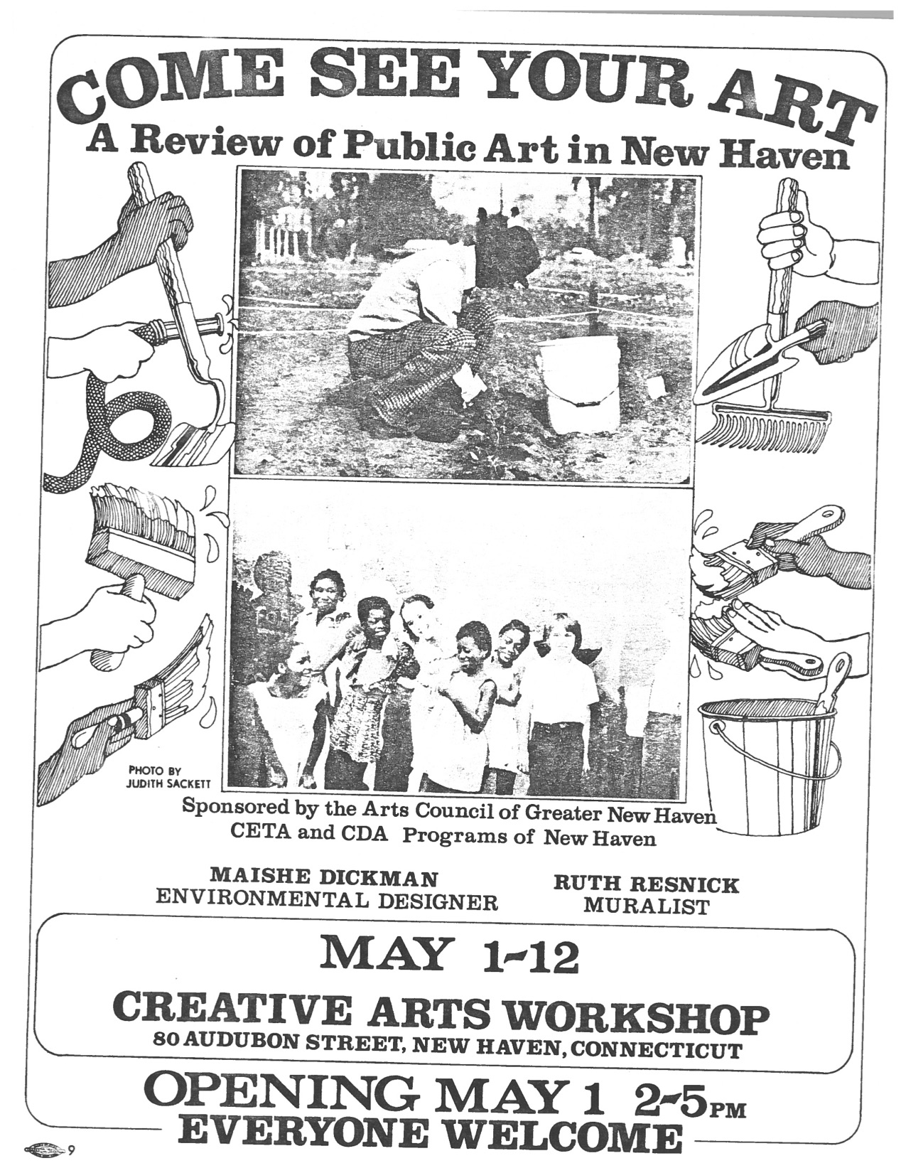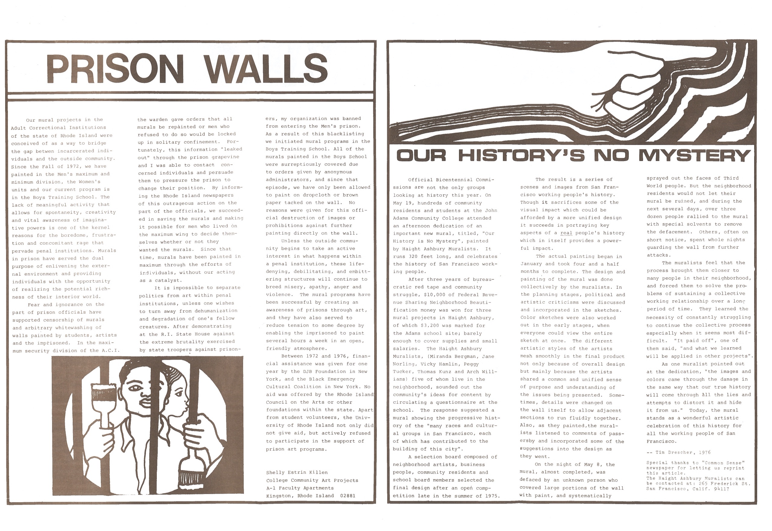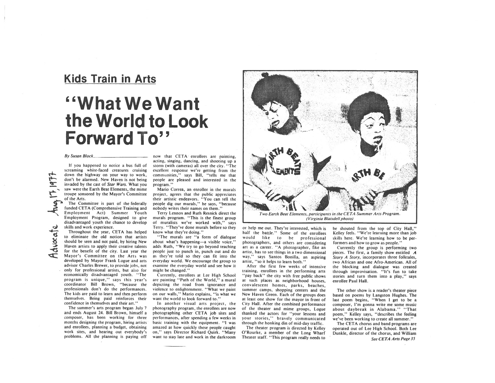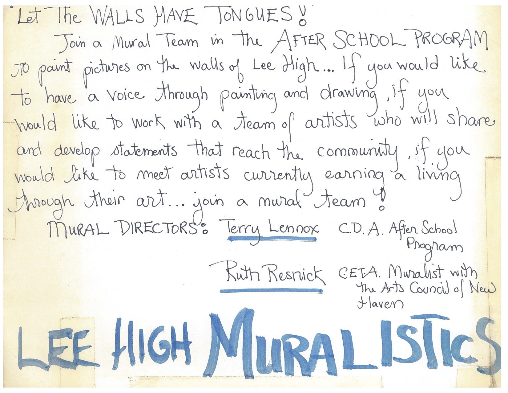 New Haven has a long tradition of arts coverage in city newspapers. The CETA program coincided with a blossoming of local arts coverage in dailies and weeklies such as the New Haven Register and the New Haven Advocate. Before the era of websites, social media, and podcasts, print media was the primary way through which New Haveners learned of the artistic activities of the Elm City. Further, it was also the way New Haven connected with the mural movement across the country and beyond, as seen in the newsletters of the National Murals Network.