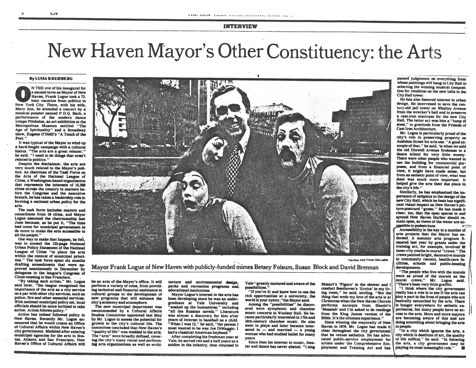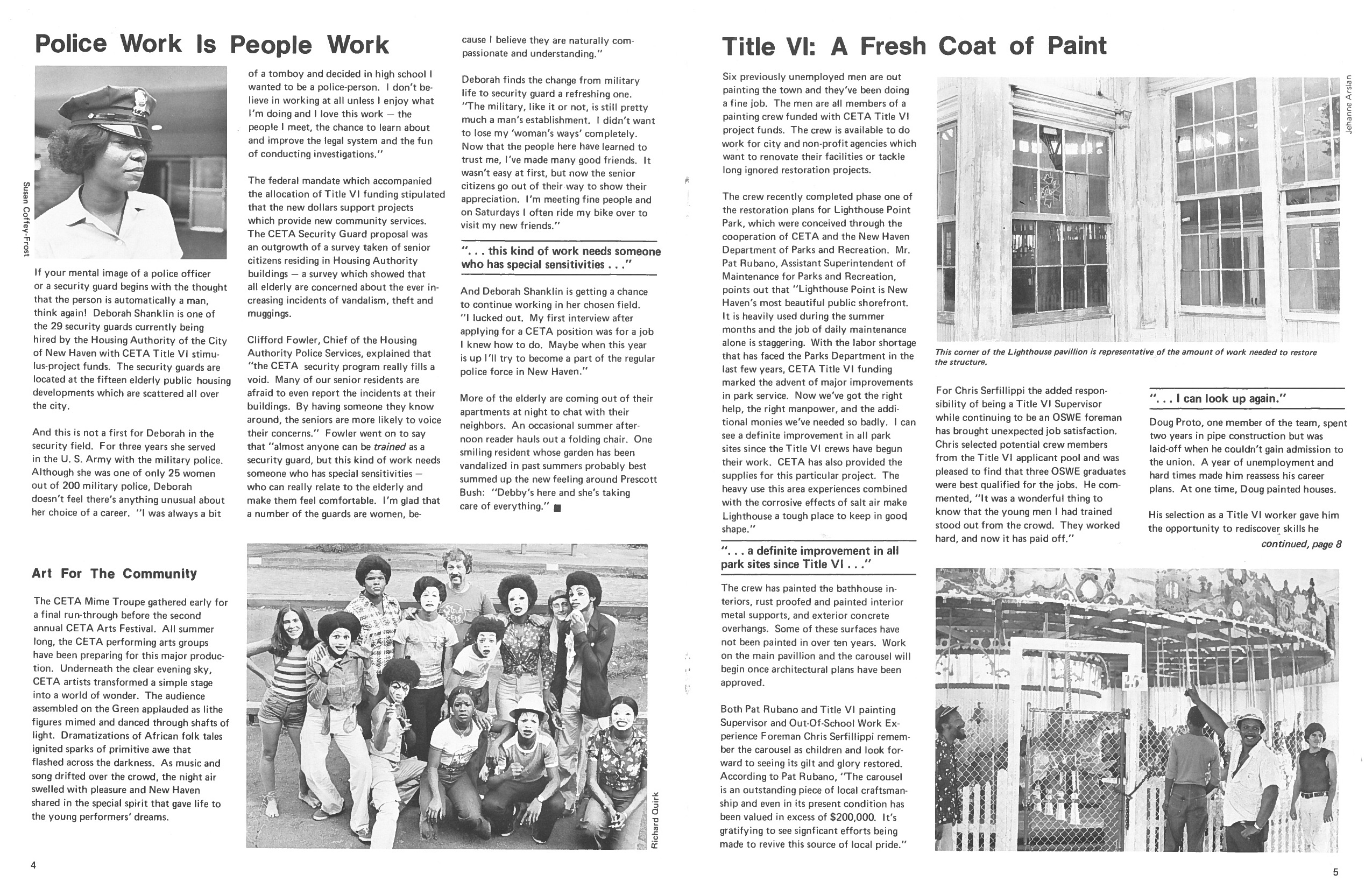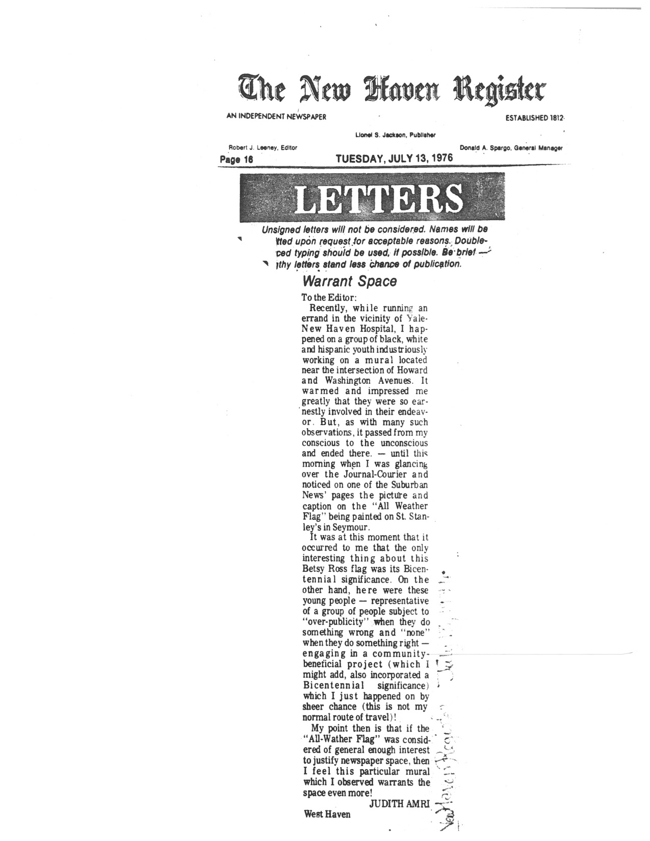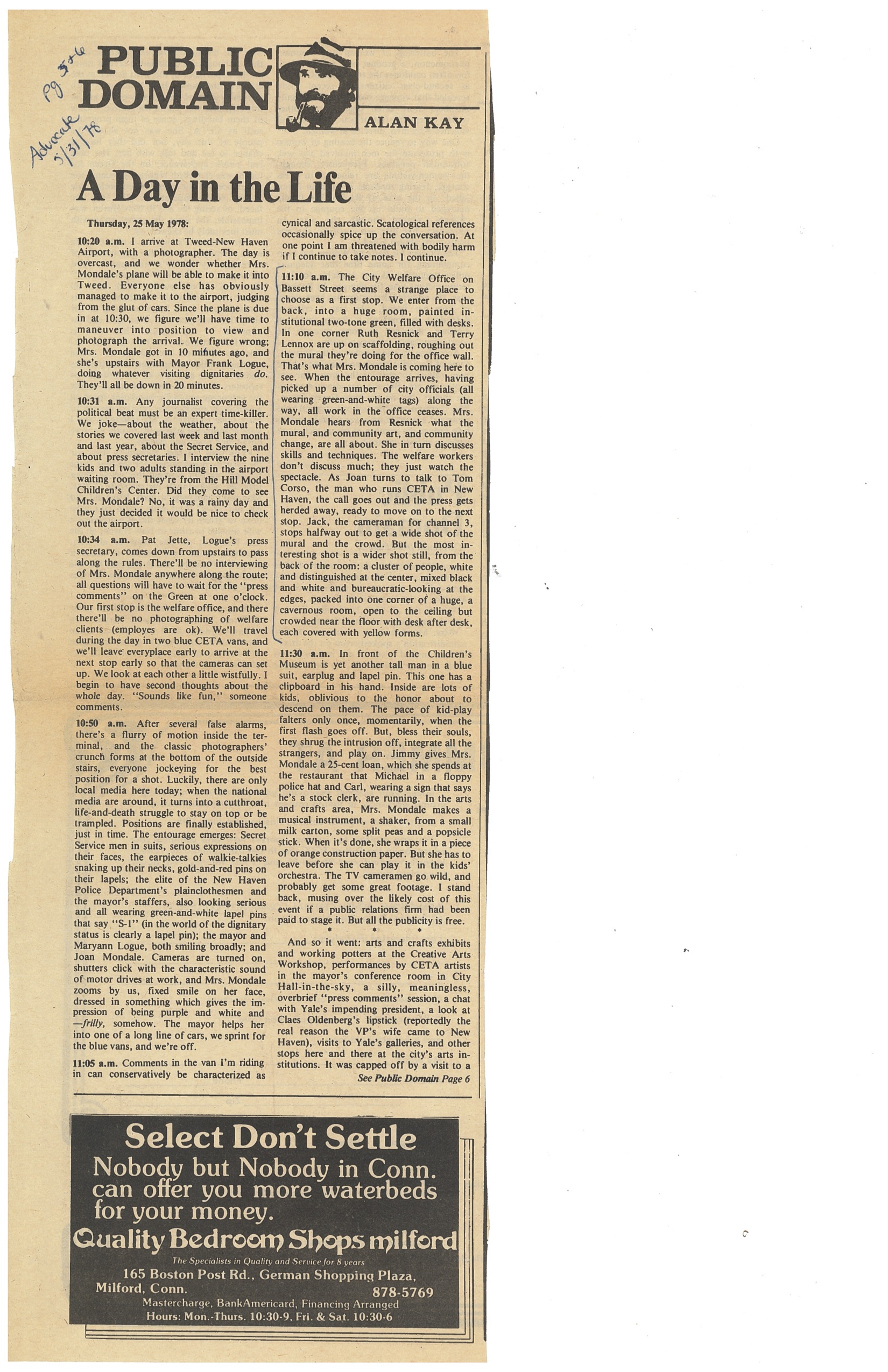 New Haven has a long tradition of arts coverage in city newspapers. The CETA program coincided with a blossoming of local arts coverage in dailies and weeklies such as the New Haven Register and the New Haven Advocate. Before the era of websites, social media, and podcasts, print media was the primary way through which New Haveners learned of the artistic activities of the Elm City. Further, it was also the way New Haven connected with the mural movement across the country and beyond, as seen in the newsletters of the National Murals Network.