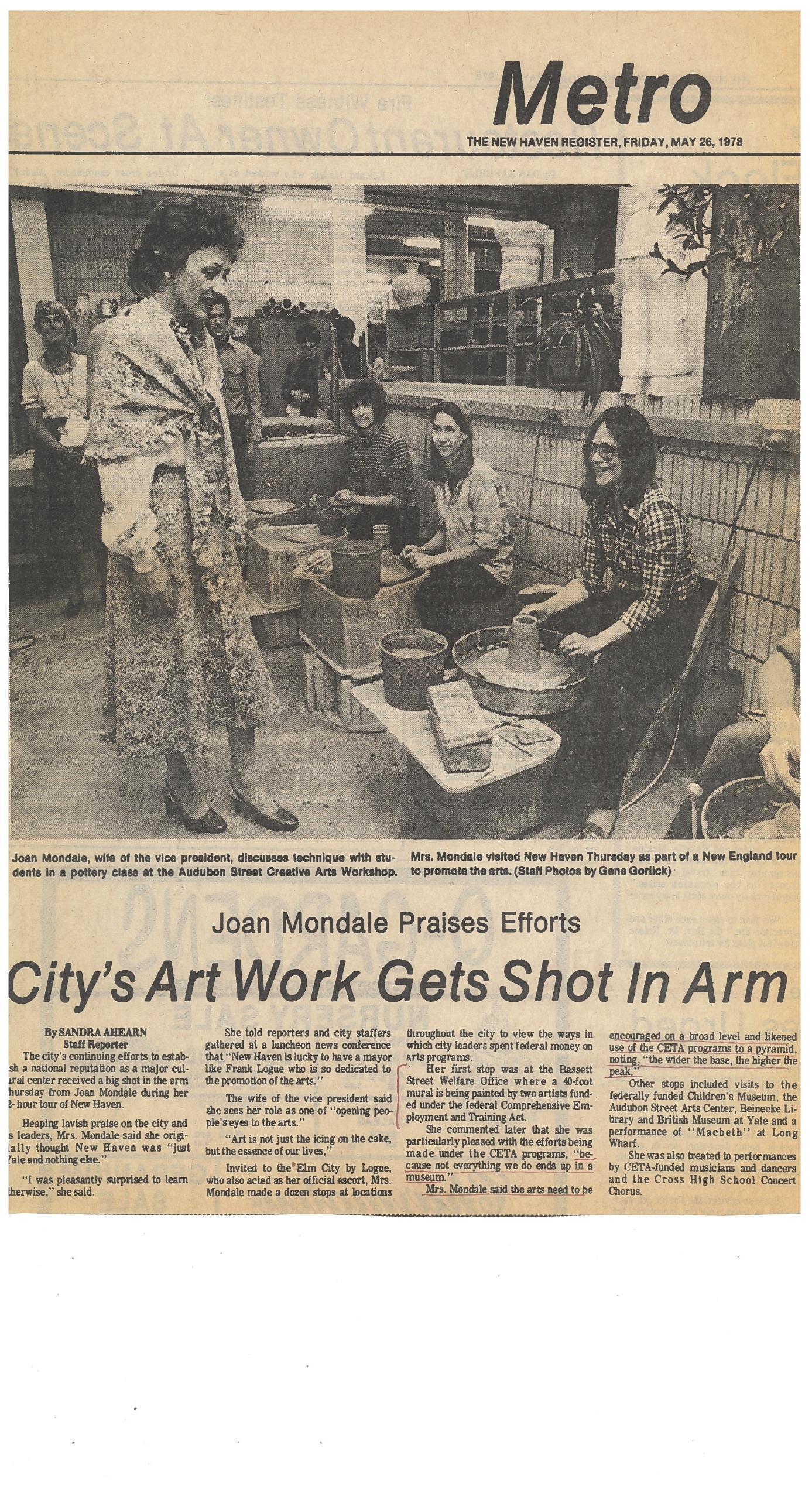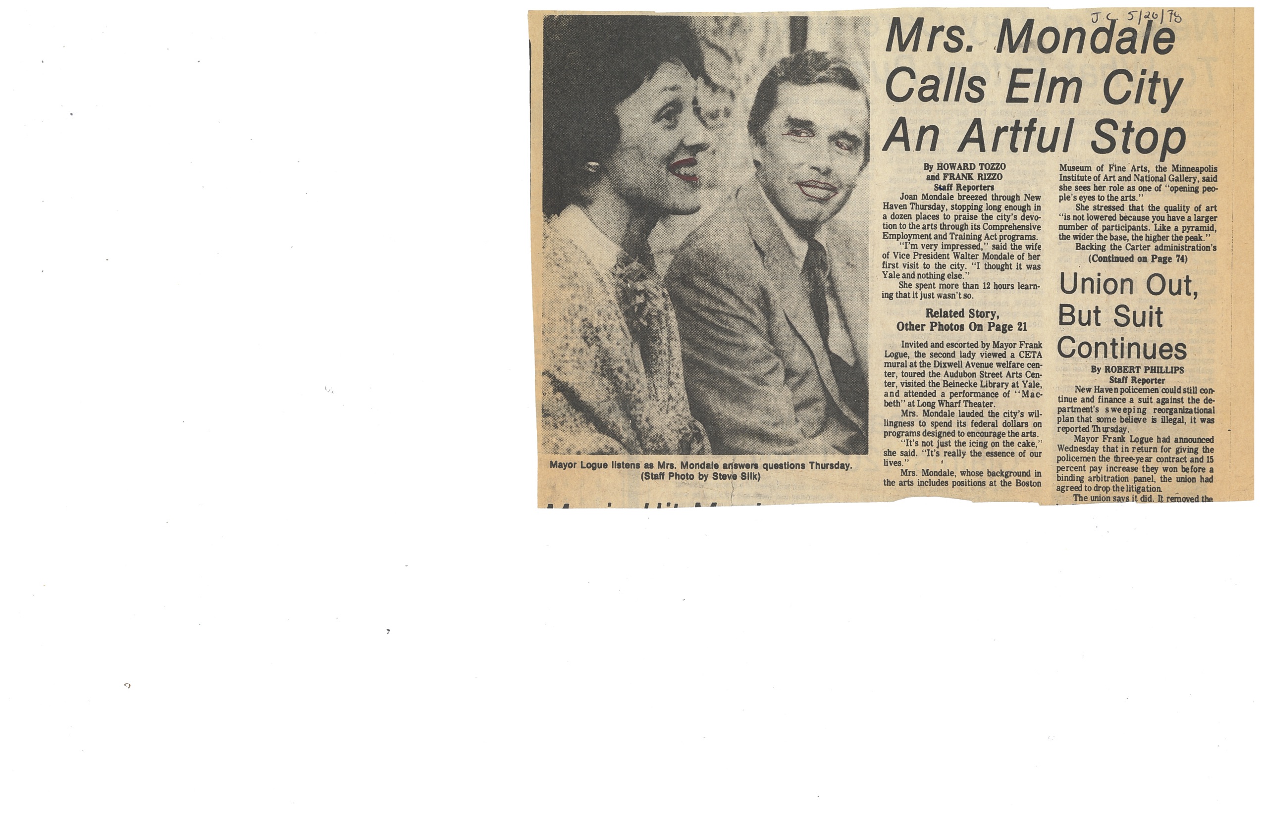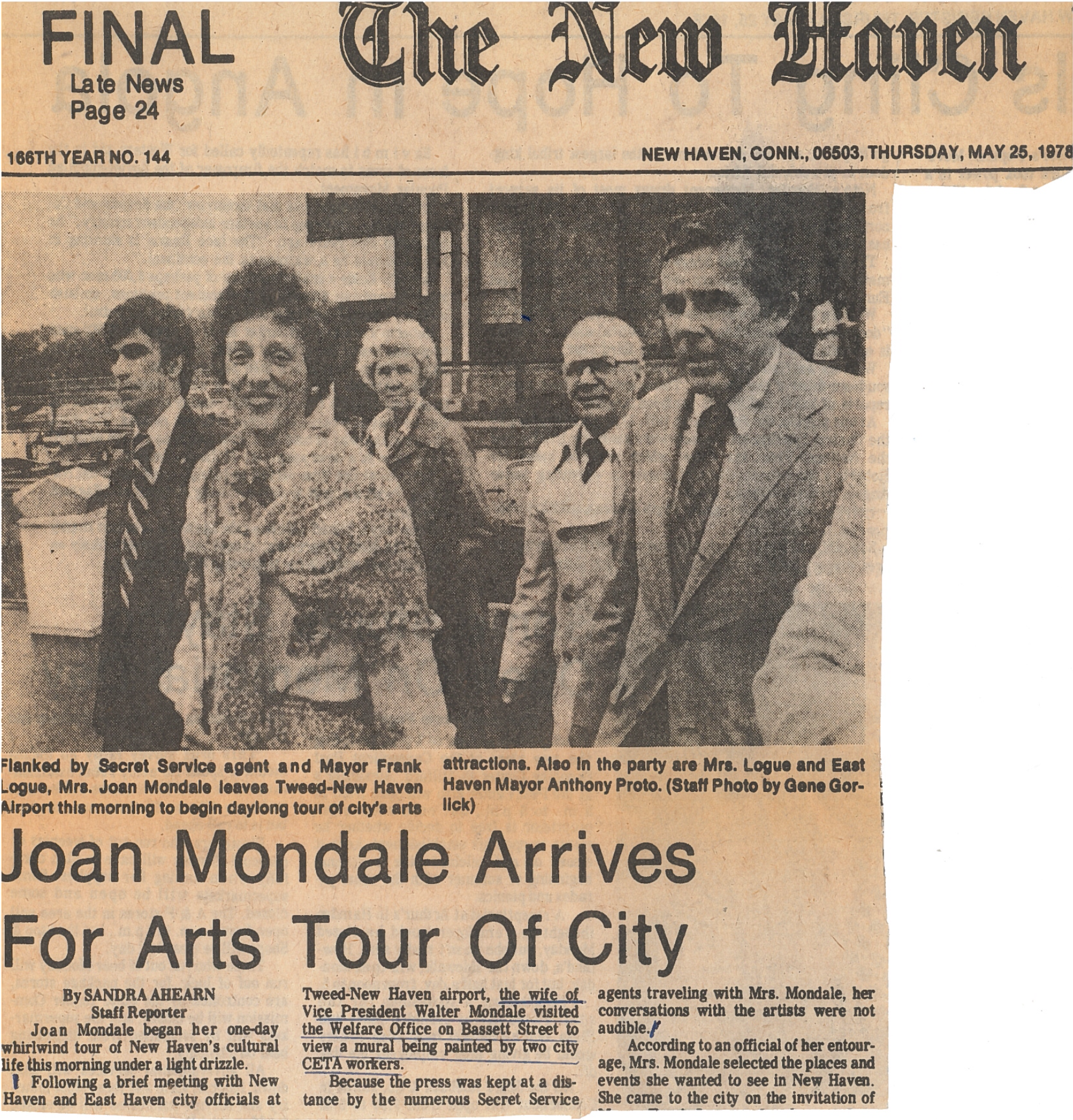 CETA projects in New Haven did not merely manifest in murals. The comprehensive program, and the way in which it was implemented, became a catalyst for new job opportunities, community engagement and enrichment programs, and conversations between community groups and the New Haven municipal government that would leave a legacy for public art throughout the city in years to come. New Haven’s CETA Murals attracted national attention – from public figures such as Joan Mondale, the wife of then Vice President Walter Mondale, and Edward Koch, the Mayor of New York City. The legacy of CETA in and outside of New Haven can be explored through the digitized archives below.