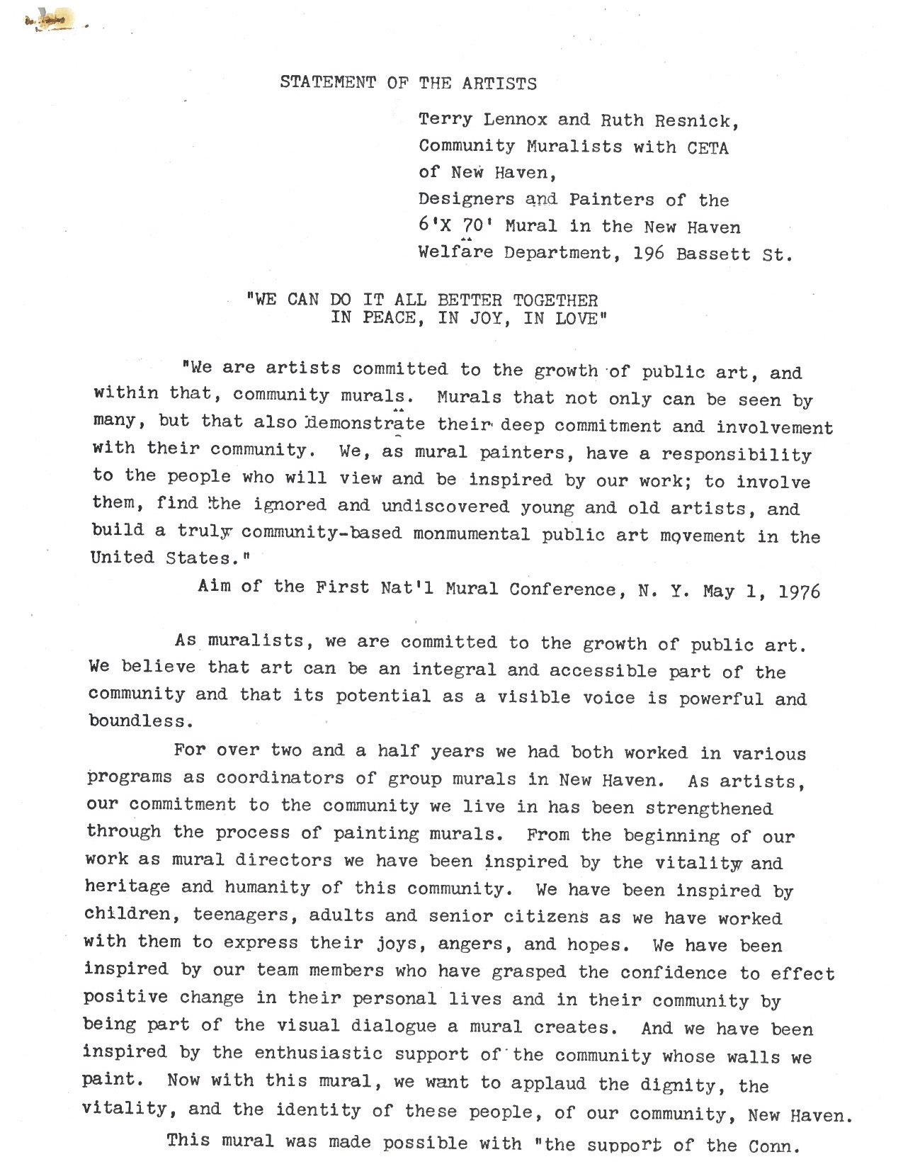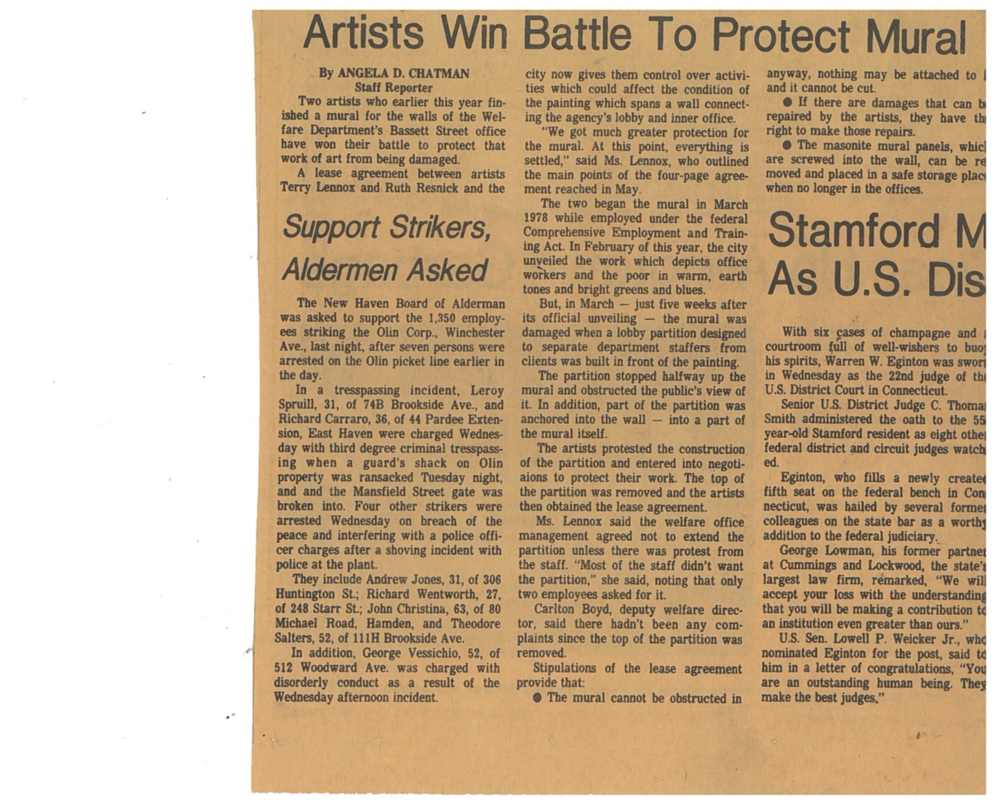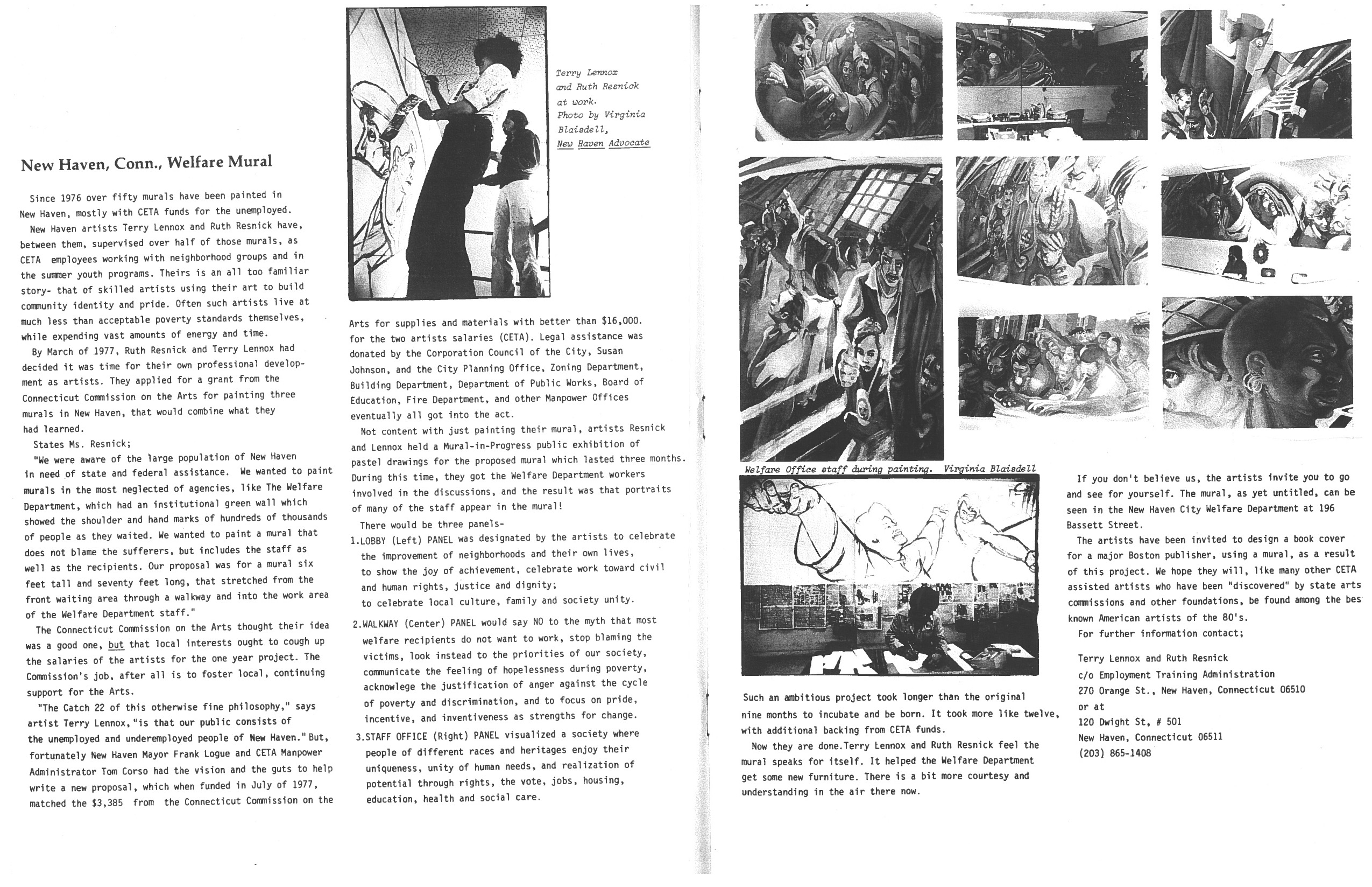 While the national CETA administration had its own challenges due to uneven funding, management, and Federal oversight, locally, the artists working with CETA were kept on the payrolls for short periods of time, and therefore needed—as artists and creatives have since time immemorial—to continue to find ways to advance their own artistic work and potential careers. Terry Lennox and Ruth Resnick, two CETA mural team leaders who became friends, sought this out together by applying for and receiving Connecticut Commission on the Arts grant funds to create a mural for the Welfare Office, located at 196 Bassett Street in New Haven. The mural was painted on Masonite panels, and featured staff and community members. Placed in the lobby and in staff work areas, the mural became an issue when a partition wall was built and attached to the mural. Eventually the Masonite panels were removed. Their location remains unknown.