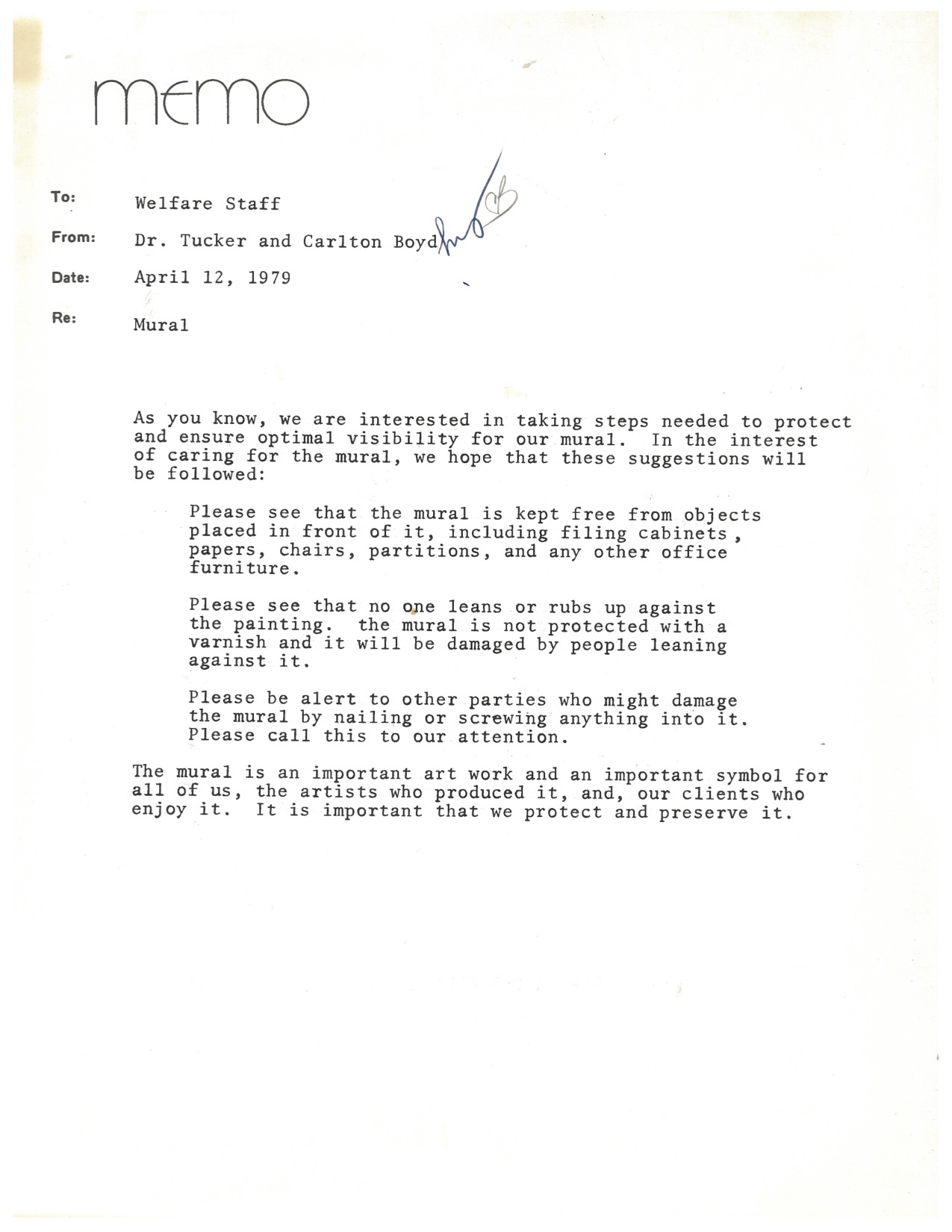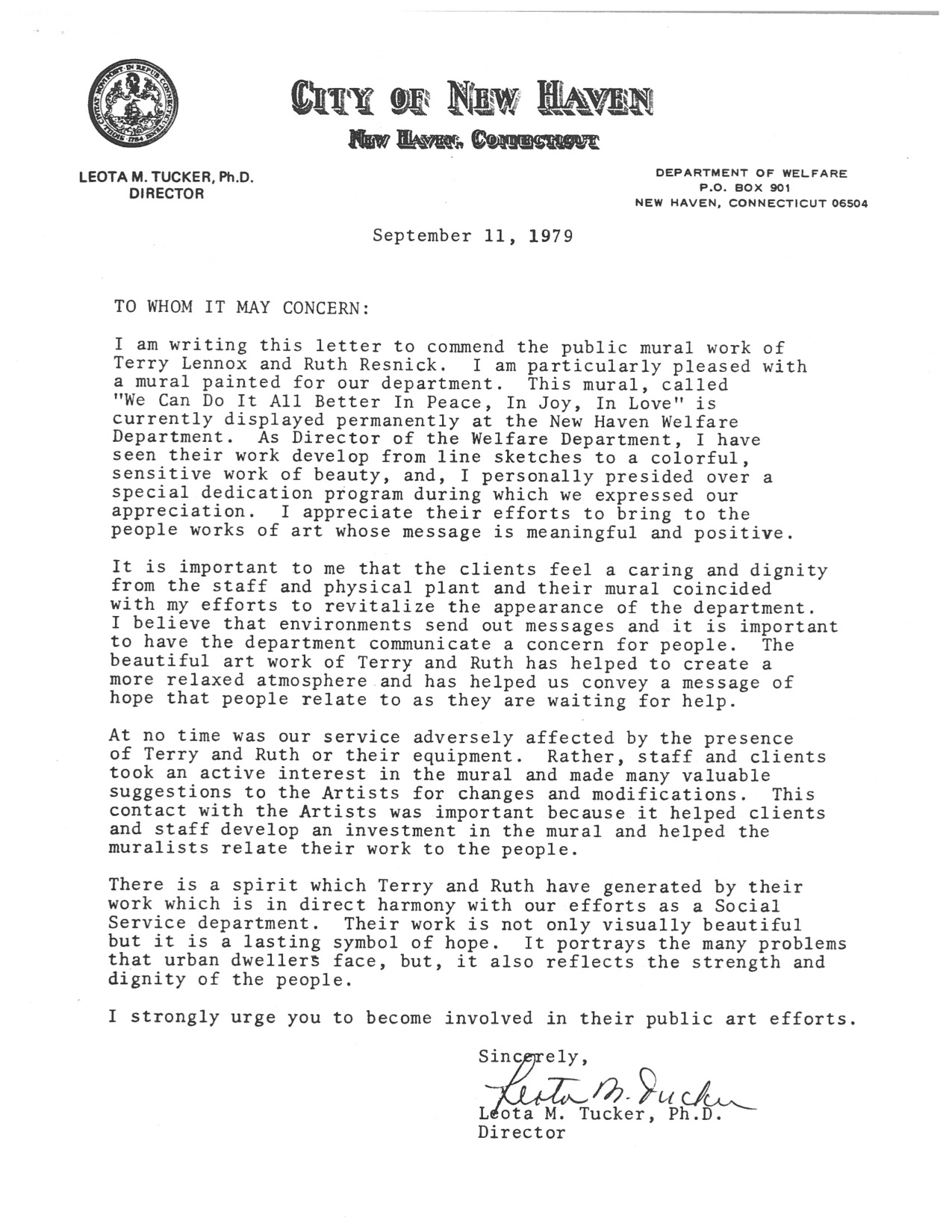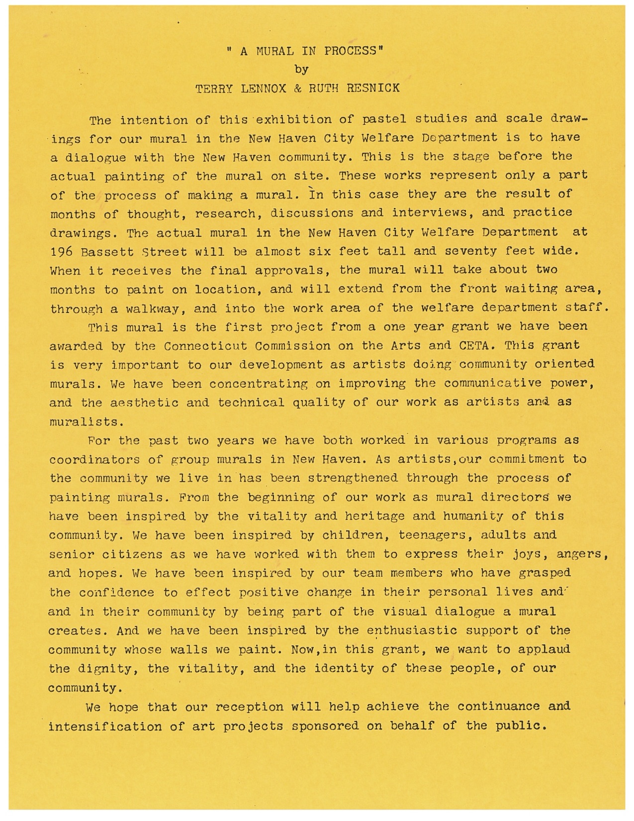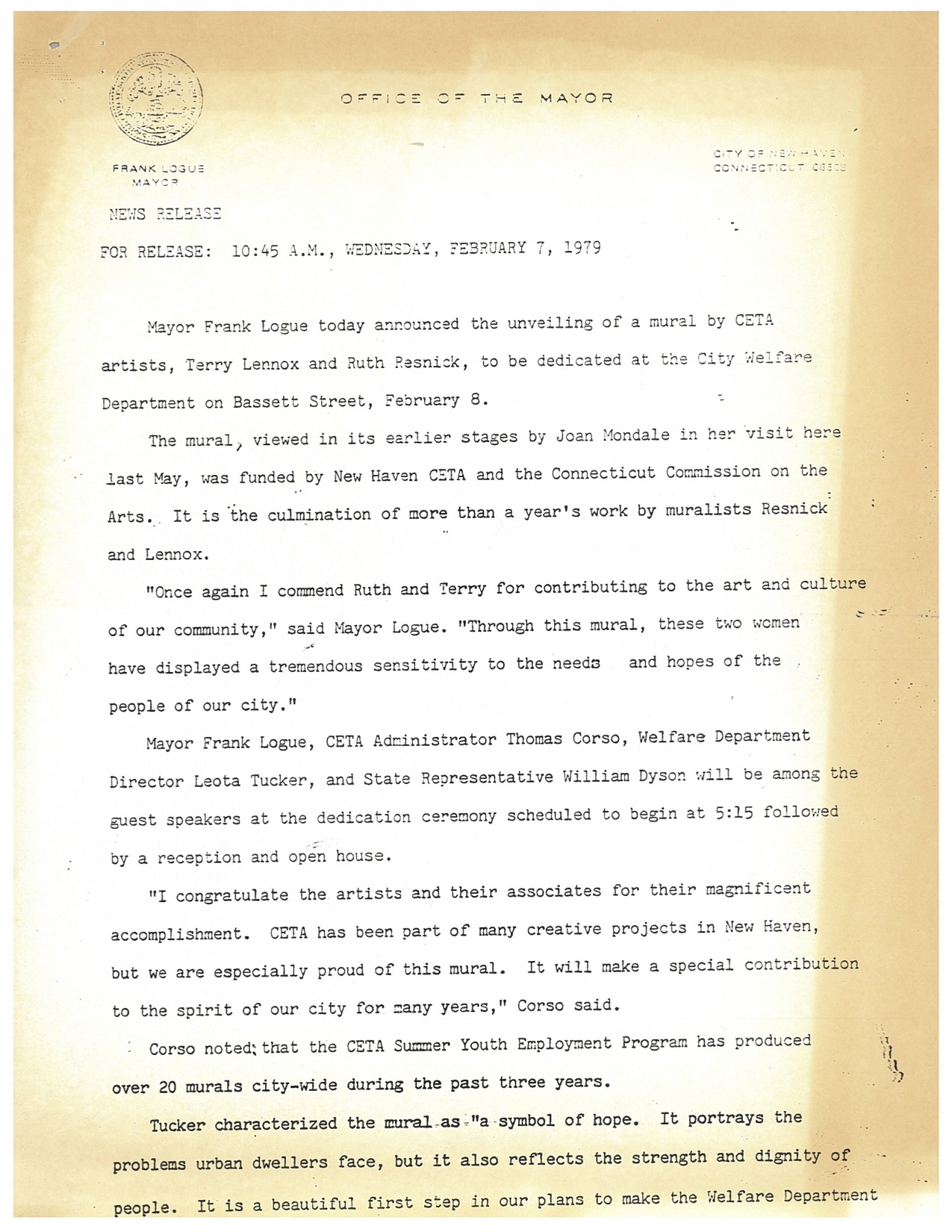 While the national CETA administration had its own challenges due to uneven funding, management, and Federal oversight, locally, the artists working with CETA were kept on the payrolls for short periods of time, and therefore needed—as artists and creatives have since time immemorial—to continue to find ways to advance their own artistic work and potential careers. Terry Lennox and Ruth Resnick, two CETA mural team leaders who became friends, sought this out together by applying for and receiving Connecticut Commission on the Arts grant funds to create a mural for the Welfare Office, located at 196 Bassett Street in New Haven. The mural was painted on Masonite panels, and featured staff and community members. Placed in the lobby and in staff work areas, the mural became an issue when a partition wall was built and attached to the mural. Eventually the Masonite panels were removed. Their location remains unknown.