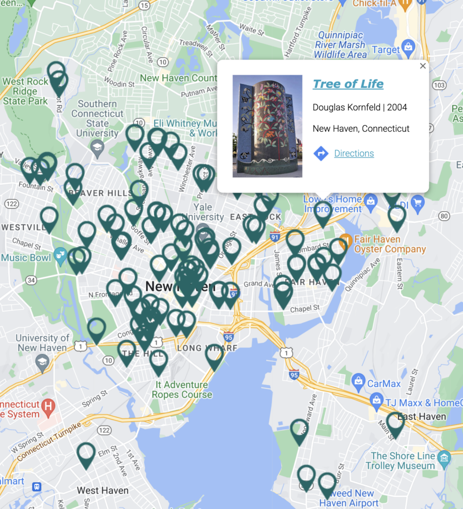 Explore an interactive map of public art around New Haven by clicking the map on your right.