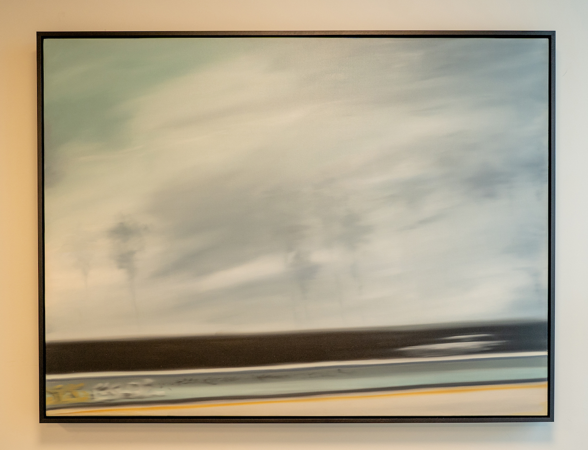 These Days was painted towards the end of a lengthy series of oils I did that started in the early 2000’s. The piece is emblematic of the series. Landscapes that intend not necessarily to be a portrait of a place, but rather an impression of a moment in that place. I, as many, arrived in Los Angeles from somewhere else, in search of a dream, of a better life, of an opportunity. Los Angeles provided that. Open vistas, endless horizons, and a transportation infrastructure both foreign and familiar. Moving fast, often in a motor vehicle, through neighborhoods, cities, that left fleeting and dreamy impressions in my mind. These works intend to be casual snapshots of moments and situations that can only occur in a place like this city. Do they depict actual locales? Or are they memories of something that was observed with the corner of the eye in a fraction of a second? It is up to the viewer to assign place, personal meaning, emotional response. The palette and treatments are quasi-photographic, painterly strokes are ‘erased’, favoring smooth gradients and avoiding sharp edges, yet the spatial treatment is accurate to how we perceive space. The intention, to bypass pictorial effect and promote the sensation of a place or moment that exists -or existed-, hopefully allowing the viewer to reprise a moment that was actually lived. – Miguel Osuna, Los Angeles, July 2020