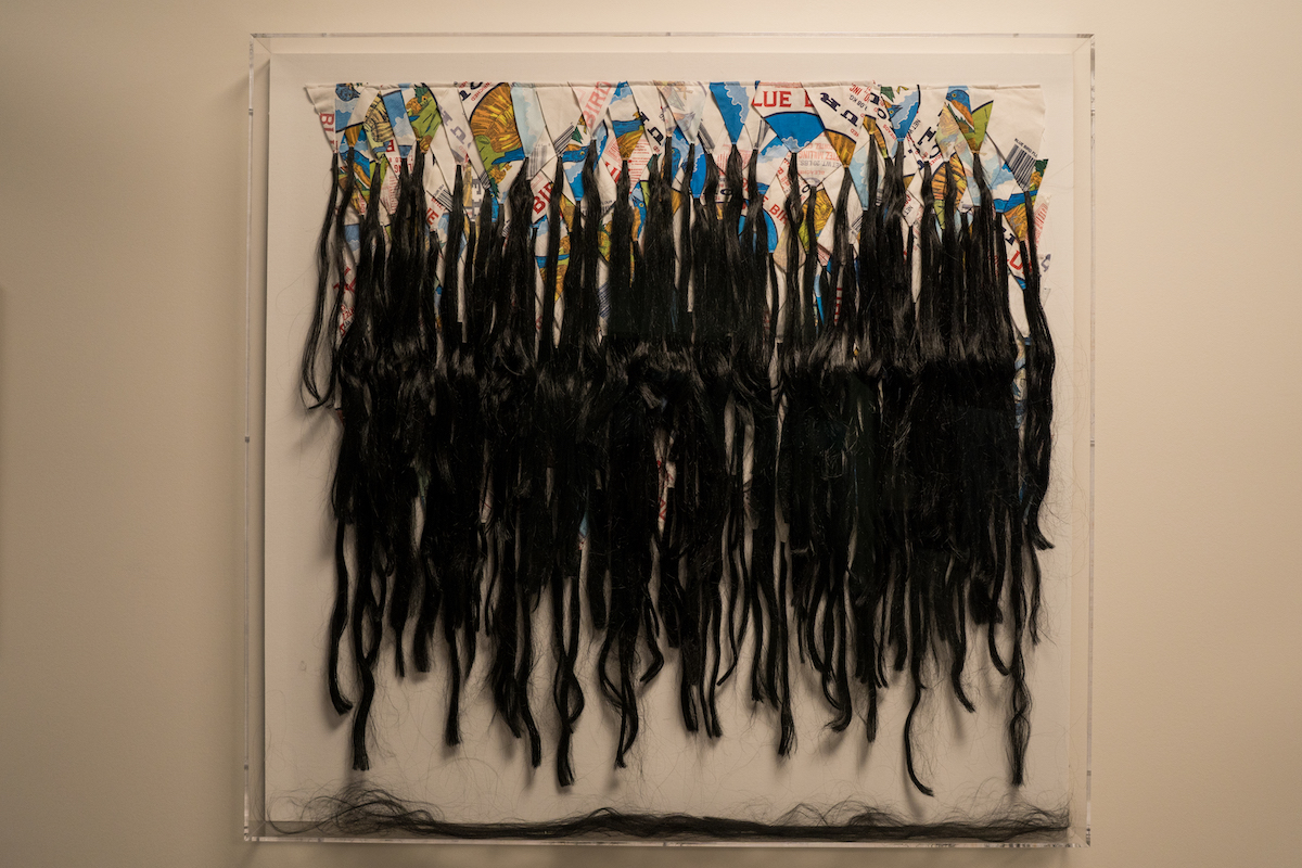 Blue Bird Flour Rug III, is a combination of Blue Bird Flour bags, a package made of cotton fabric for baking flour used by many Diné on the Navajo Nation, and black, synthetic hair merged together. Together these two materials, both of which Robbins has worked with obsessively over the years, form a rug based off of a traditional Diné design. Like all of Robbins’ work, this is a combination of real, manipulated objects from the reservation and items of the “Indian” archetype, forcing the viewer to question the authenticity of what it is that they are witnessing.