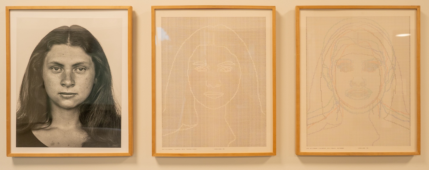 Gaines’ portrait series “Faces” converts photographs into numbered grids that remove many of the features used to determine identity, shifting them into mapping systems that challenge the viewer’s responses to those features.