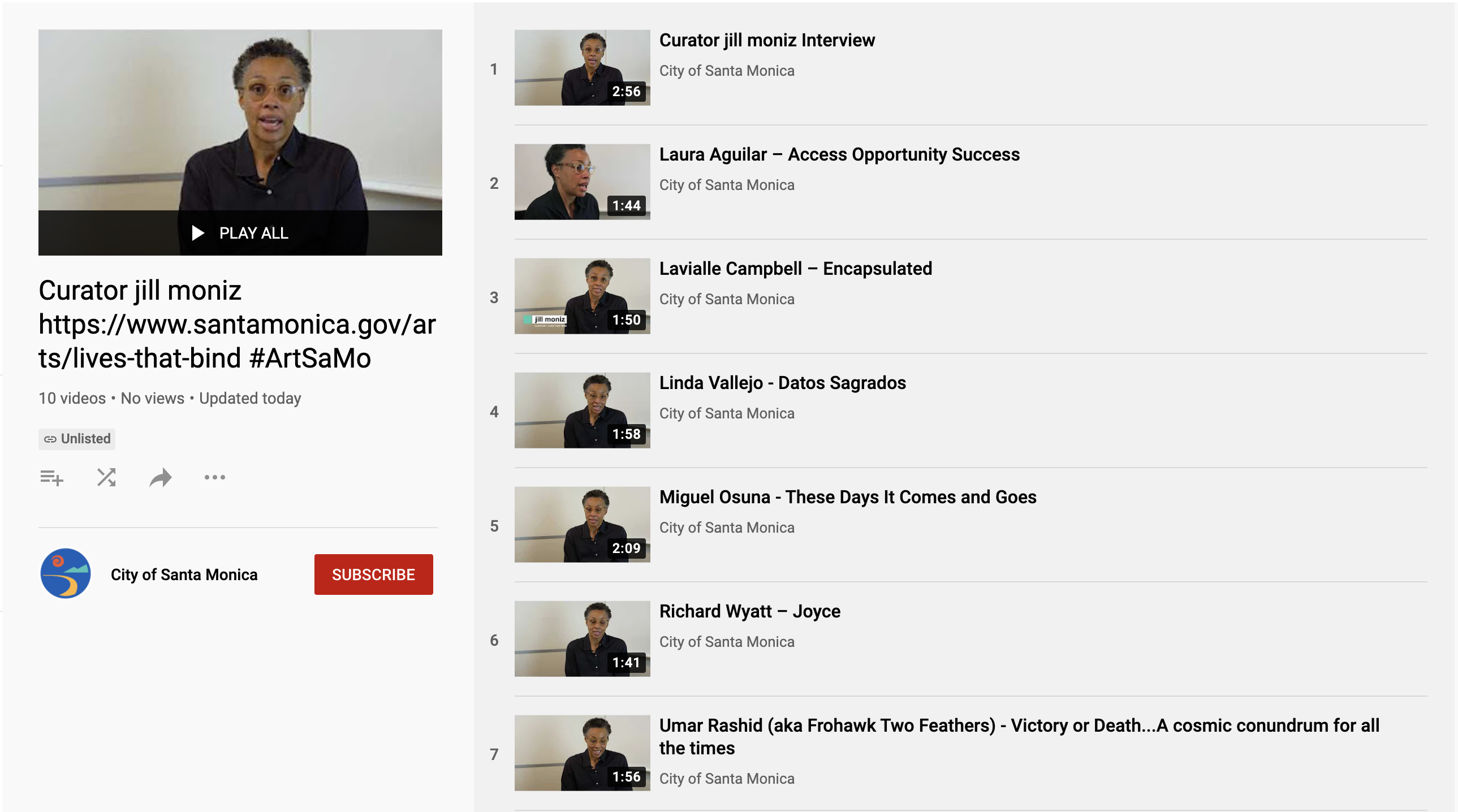 Estas obras representan las muchas voces que contribuyen al paisaje cultural de Santa Mónica, y ayudan a visualizar la importancia de sus comunidades diversas. Las piezas de Lavialle Campbell, Miguel Osuna, Umar Rashid, Emma Robbins y Linda Vallejo se unen a las de Laura Aguilar, Charles Gaines, Kerry James Marshall, Alfredo Ramírez, Alison Saar, John Valadez y Richard Wyatt, contribuyendo a una articulación histórica de “Lives that Bind” o “Vidas que Unen”.