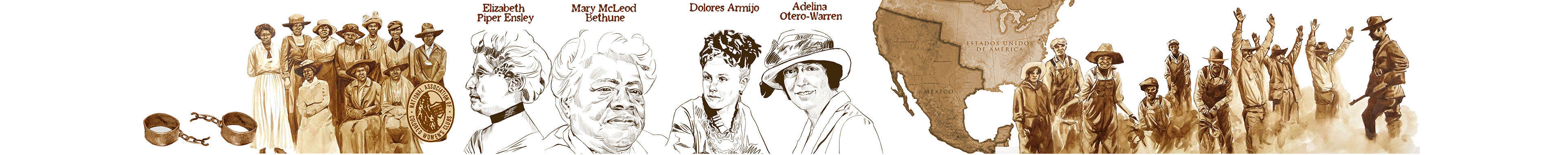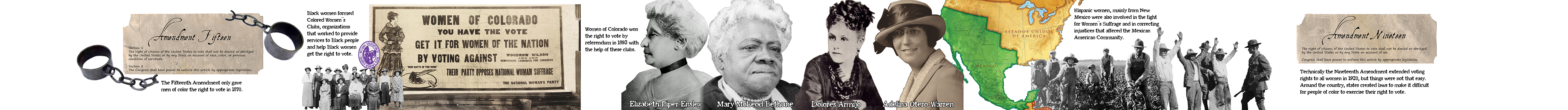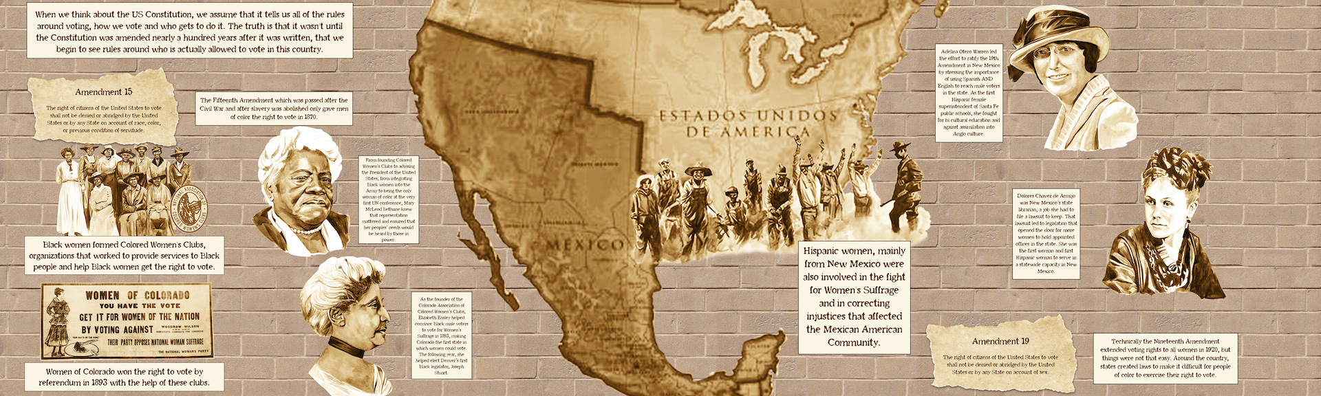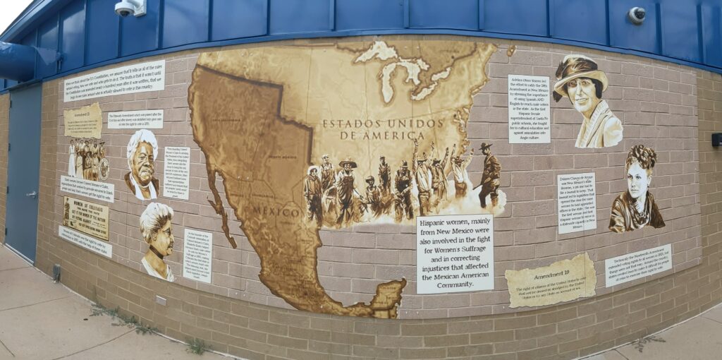 Rendered in sepia tones, a historical map of the United States serves as the central image of the mural panel installed to the left of the library entrance, which tells the story of the Women’s Suffrage Movement in the Western United States leading up to the passing of the 19th Amendment. The artwork begins with reference to the 15th Amendment, the ratification of which gave men of color the right to vote in 1870. Below this introduction, Norris traces the reaction to this amendment and the resulting emergence of Women’s Suffrage movements, including Colored Women’s Clubs and the National Women’s Party. The map is surrounded by four portraits highlighting significant figures in the quest for women’s suffrage, including Mary McLeod Bethune, a civil and women’s rights leader who eventually founded Bethune-Cookman University; Elizabeth Piper Ensley, a Coloradan who played a major role in women gaining the right to vote in Colorado before the passing of the 19th Amendment; Adelina Otero-Warren, the first Hispanic woman to run for U.S. Congress; and Dolores Armijo, the New Mexico state librarian who fought and won a gender discrimination lawsuit after the governor sought to replace her. In 1893, decades before the passing of the 19th Amendment, Colorado became the first state in the U.S. to enact women’s suffrage by popular referendum. The 19th Amendment, which gave all citizens of the United States, regardless of sex, the right to vote, officially passed in 1919 and was ratified in 1920.