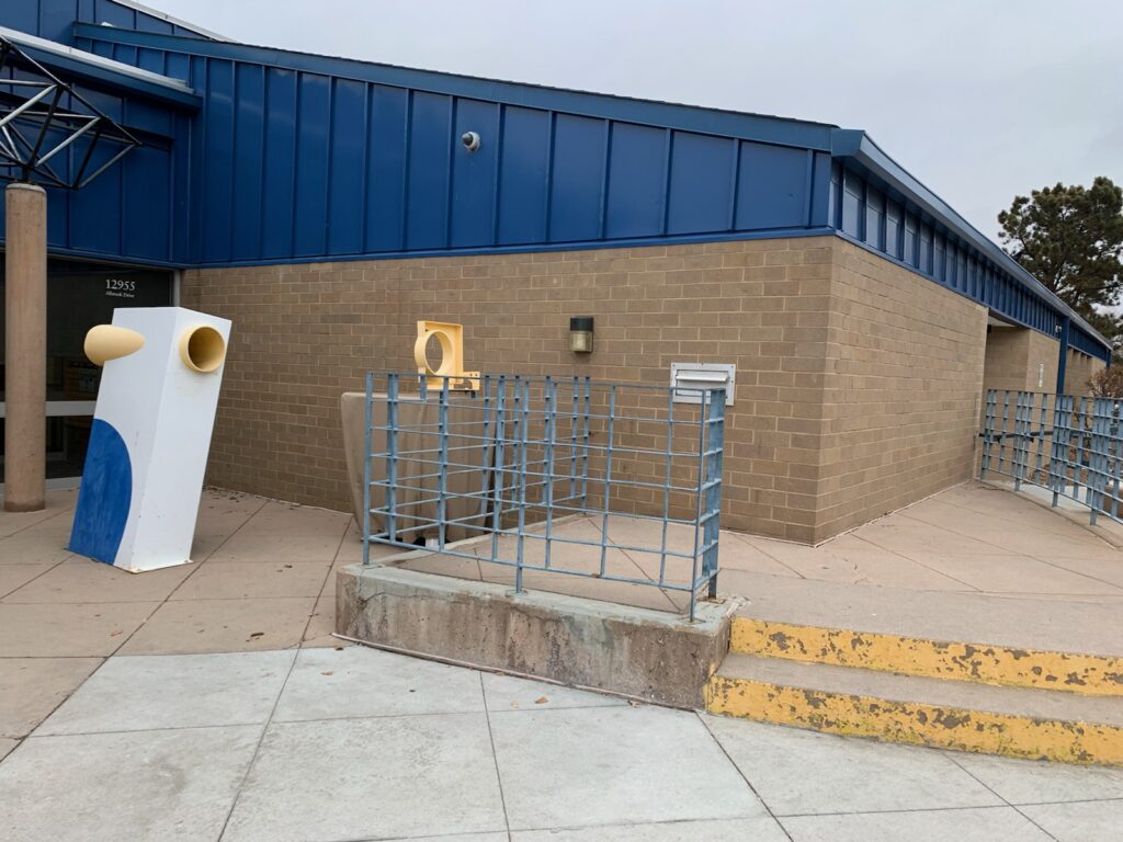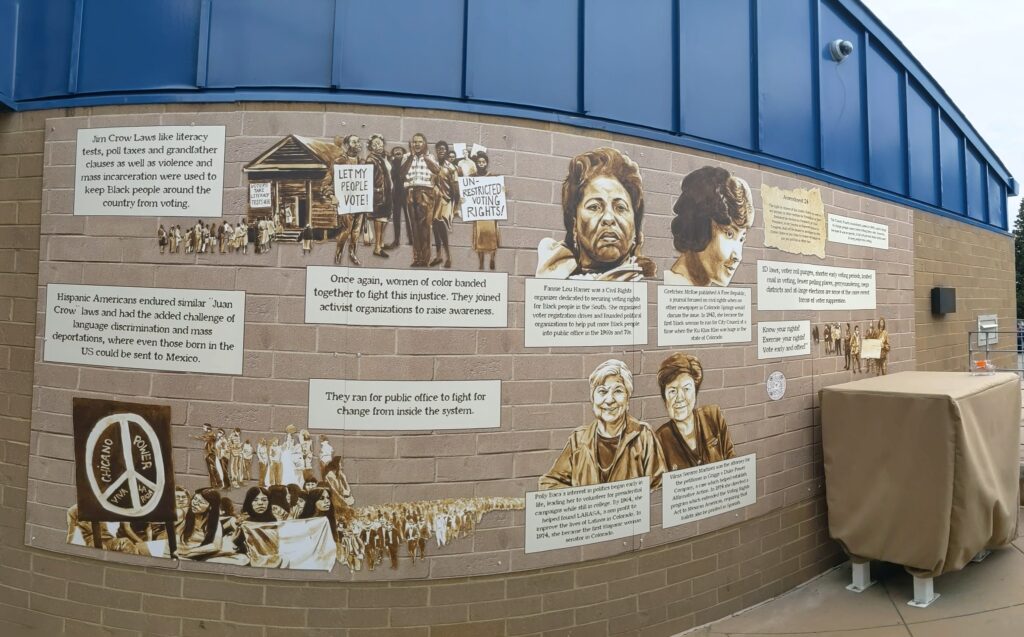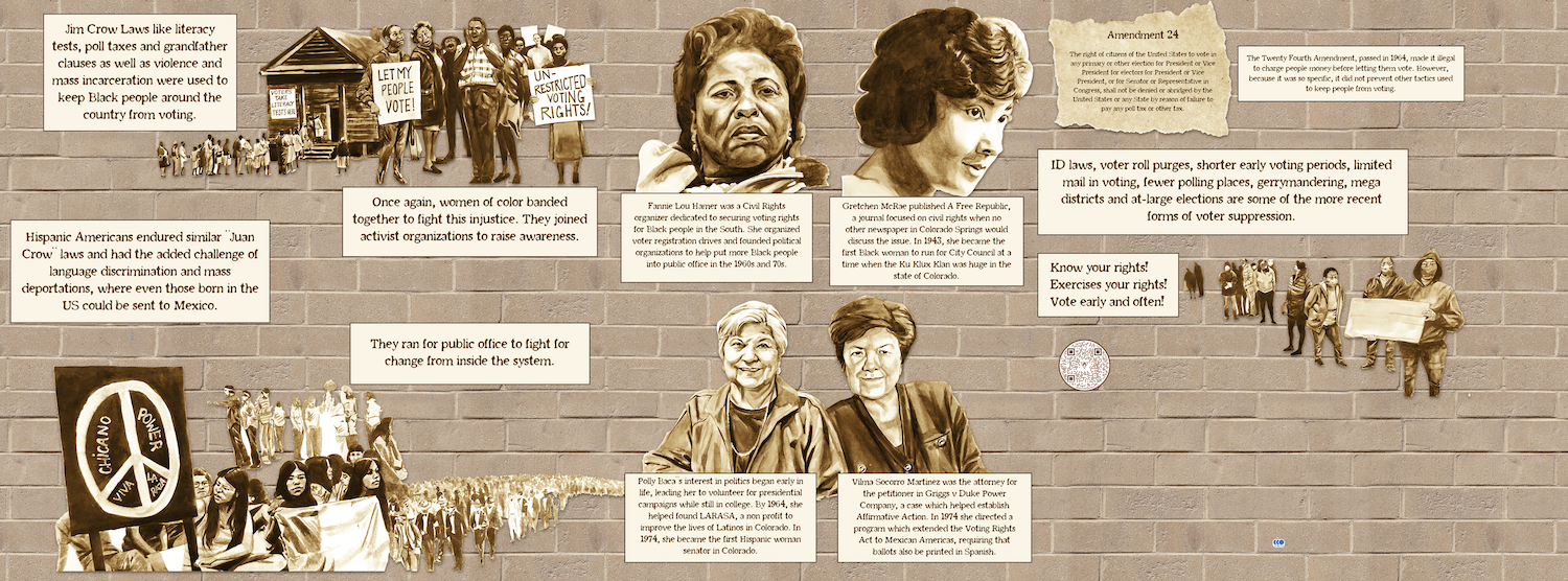 The mural’s narrative continues on the right side of the library’s entrance with an exploration of suffrage movements after the ratification of the 19th Amendment. Norris depicts scenes of activists who fought against Jim Crow and similar “Juan Crow” laws used to prevent Black and Hispanic Americans from voting. Women of color served at the forefront of movements aimed to end these forms of voter suppression. Once again, the portraits of four prominent figures integral to efforts to combat these injustices are featured: Fannie Lou Hamer, who helped to found the National Women’s Political Caucus; Gretchen McRae, the first Black woman to make the ballot by running for City Council in Colorado Springs in 1943; Polly Baca, the first Latina and minority woman elected to the Colorado State Senate; and Vilma Socorro Martinez, a leading advocate for civil rights for Hispanic Americans. Continuing to the right of the portraits, the mural features the passing of the 24th Amendment, which made poll taxes illegal in federal elections, thereby expanding voter access among historically disenfranchised groups, including communities of color. However, as Norris mentions in the mural’s text, “ID laws, voter roll purges, shorter early voting periods, limited mail-in voting, fewer polling places, gerrymandering, mega districts, and at-large elections are some of the more recent forms of voter suppression.” The final images of the mural coalesce poignantly at the site of the voter ballot return box installed outside the library entrance, functioning as a rousing reminder of the continuing fight for equitable voting practices and a call to action to remain vigilant about one’s rights and to vote accordingly.